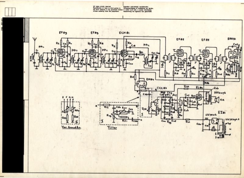 Opvallend is wel dat er vanaf 1948 kennelijk geen omroep radio's meer gemaakt worden met een HF voorversterker. Van Philips is de BX671A en van Erres is de KY477 zover ik weet de laatsten. Bij radio's met rimlock of noval buizen zie je nooit een HF buis voor de mengbuis ECH42 of ECH81. Bij transistor radio's zijn er bijna altijd twee middenfrequent trappen en wordt het antennesignaal steeds direct aan de mengtransistor toegevoerd.