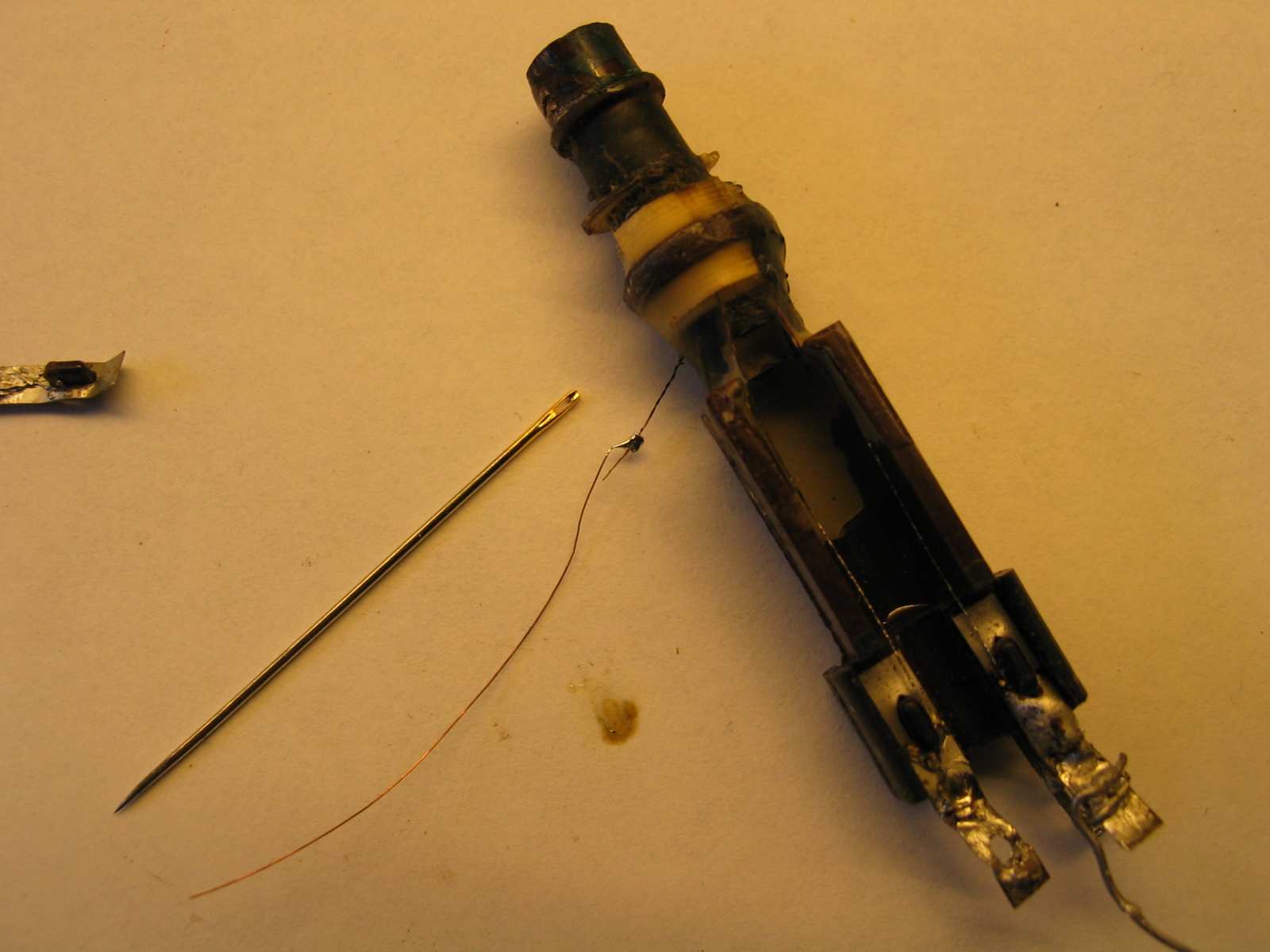 Inmiddels heb ik het uiteinde van het spoeltje kunnen vinden met een vergrootglas en een leesbril en heb ik een dun draadje van soldeerlitze om de dunste naald uit de naaidoos gewikkeld om er een oogje aan te kunnen maken. Met mijn lichtste soldeerbout de eindjes aan elkaar geknoopt: