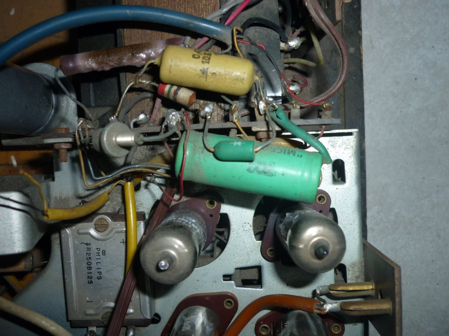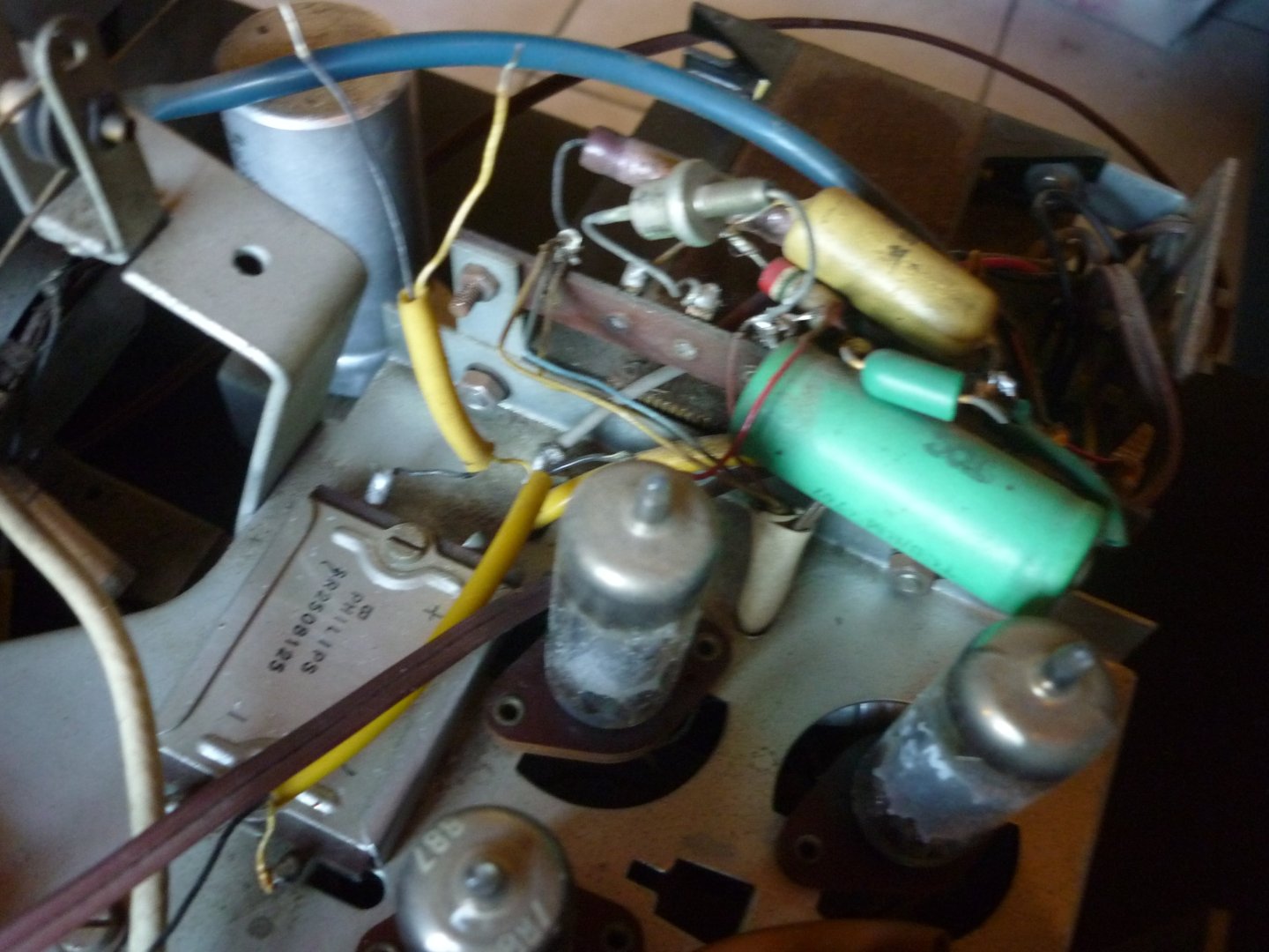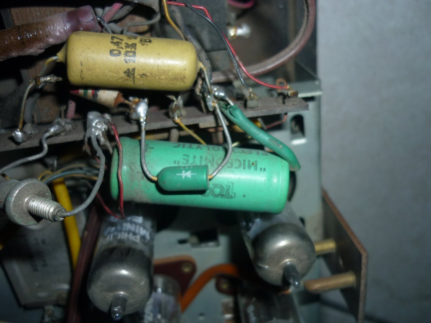 Verder kun je maar beter eerst die nieuwe bruggelijkrichter aanbrengen, maar de + pool even nergens aan verbinden. Dan tussen die + pool en de rest van het toestel een gloeilamp aansluiten van 40 Watt. Zo kun je zien waar de grote sluitingmaker zit (vaak de voedings- elco's)