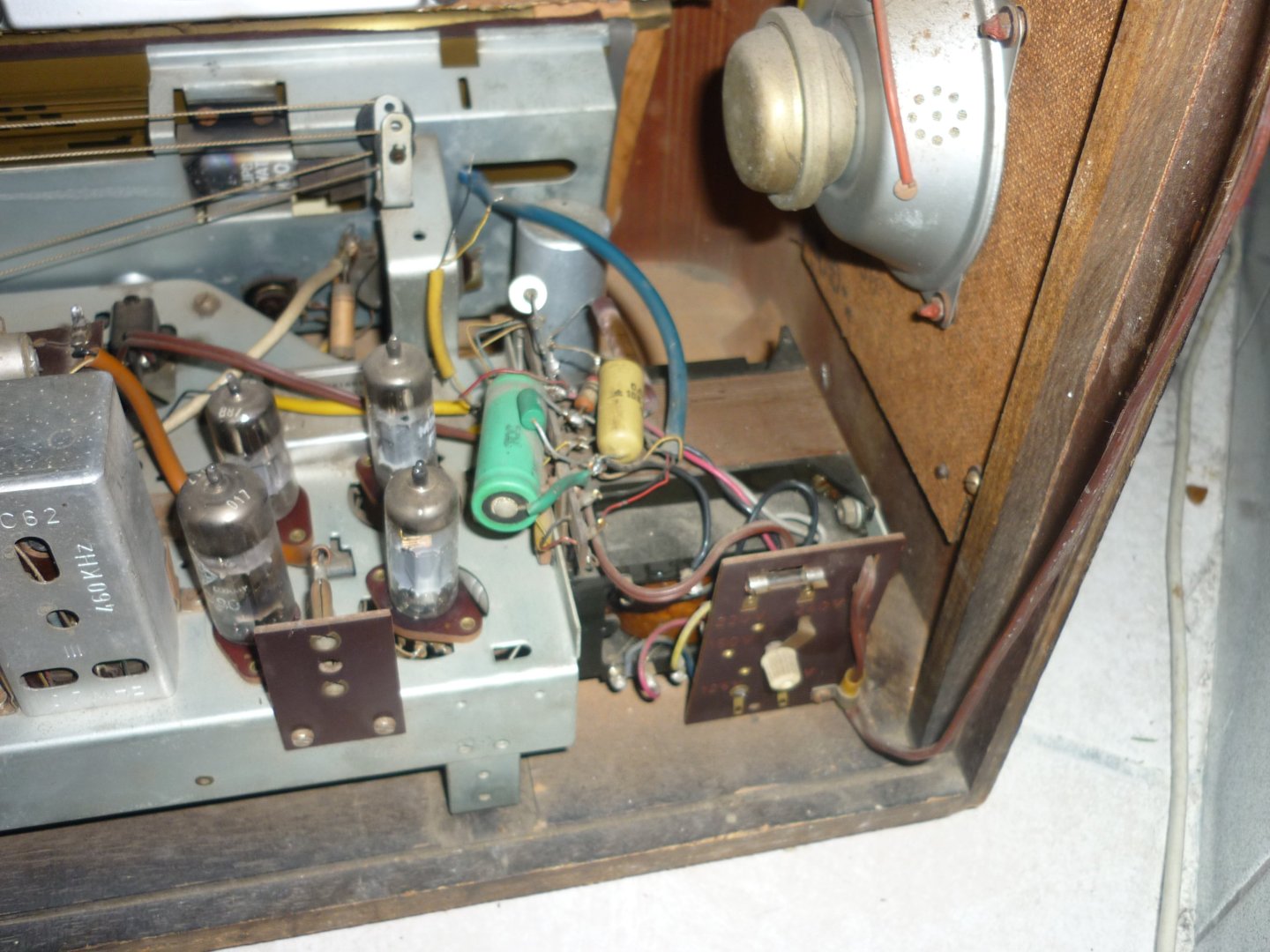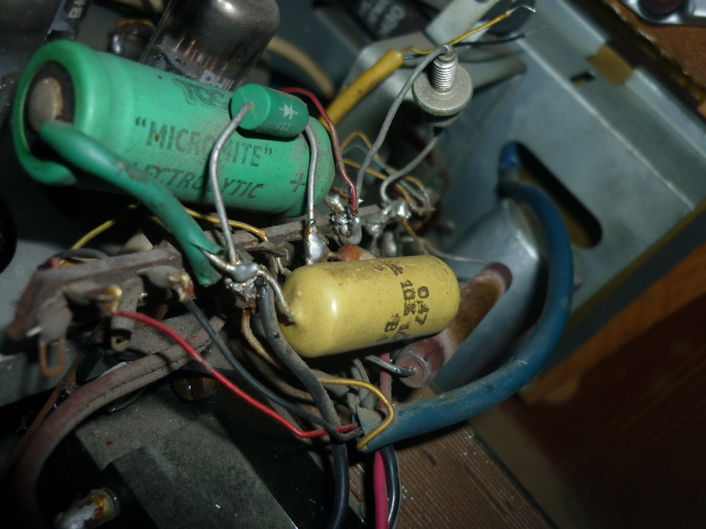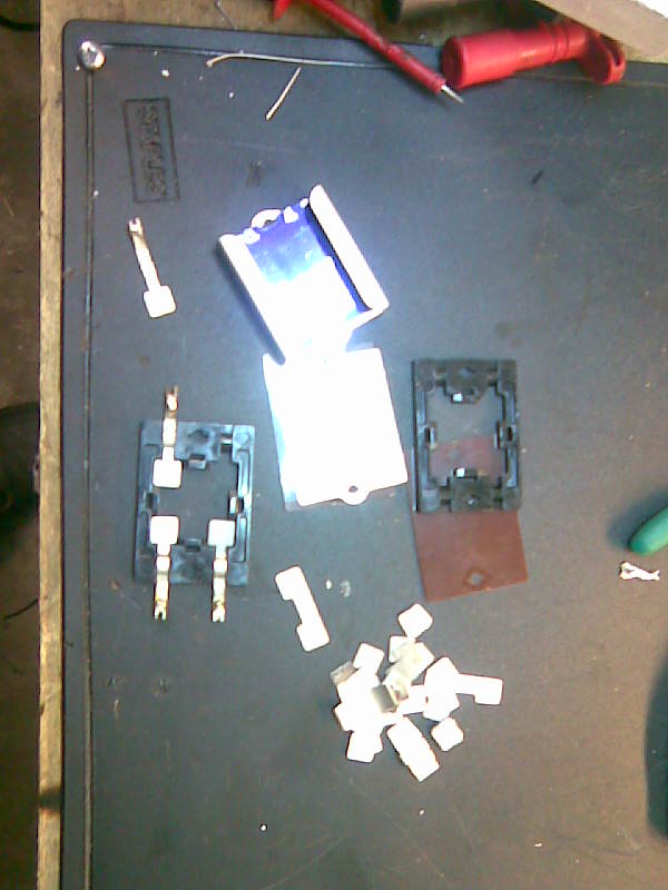 Verder kun je maar beter eerst die nieuwe bruggelijkrichter aanbrengen, maar de + pool even nergens aan verbinden. Dan tussen die + pool en de rest van het toestel een gloeilamp aansluiten van 40 Watt. Zo kun je zien waar de grote sluitingmaker zit (vaak de voedings- elco's)
