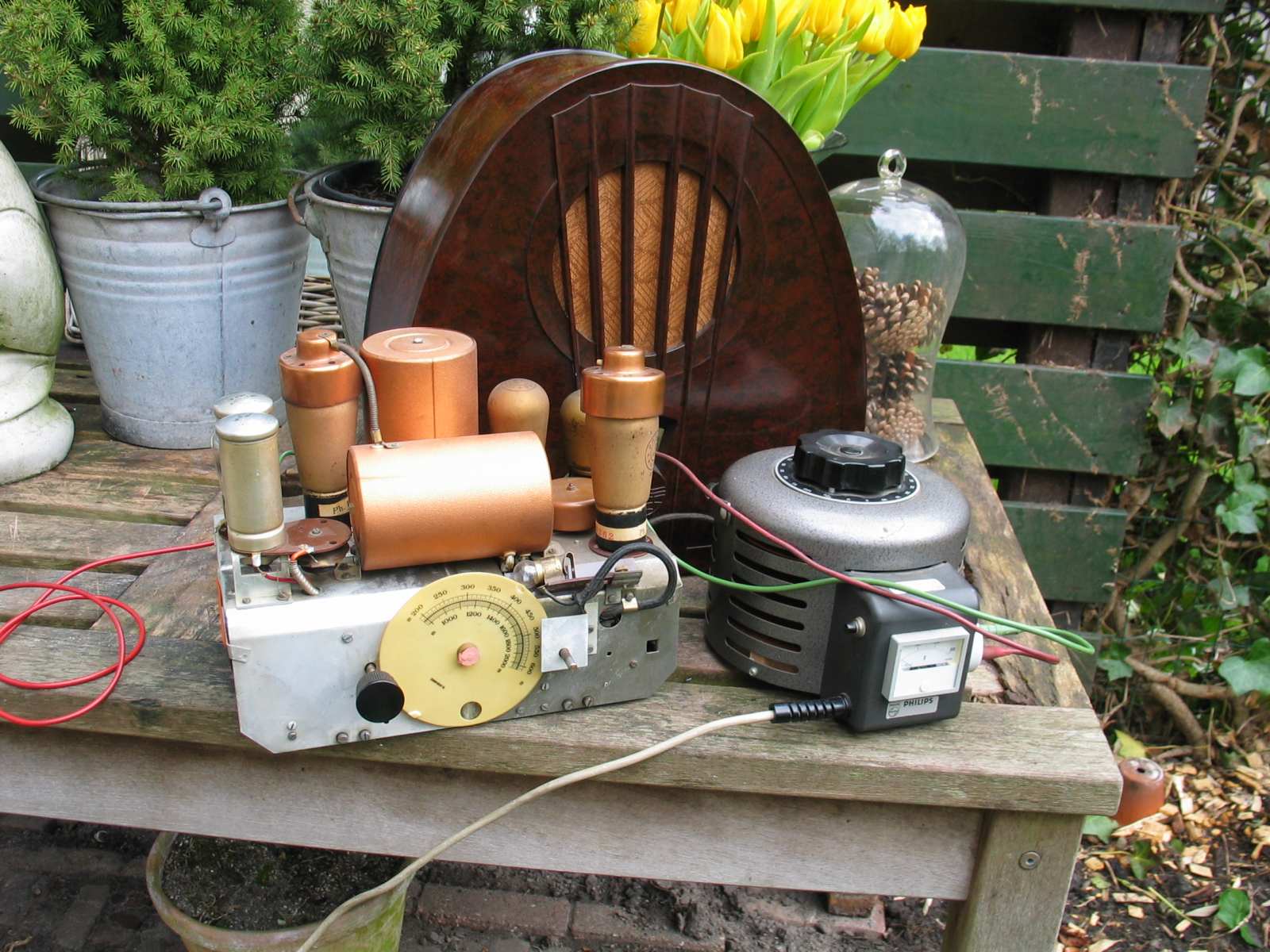 Er was niet veel aan de hand met het paasei; de oorzaak waarom de radio helemaal niets meer deed lag aan vervuilde contacten van de netschakelaar. Een wolkje elektronicavet uit een spuitbusje deed wonderen! Verder laat ik het toestel, op het netsnoer na - zoals hij was: onaangeroerd. Alleen hangt hij nu nog aan de variac om de elco's te formeren.