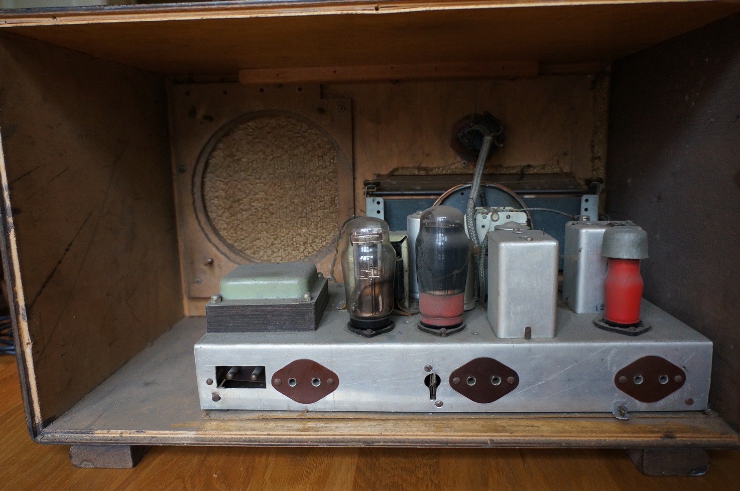 Deze radio draait op 125volt en was de losse luidspreker kwijtgeraakt in de loop der tijd.