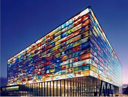 Het uit gekleurd glas opgetrokken "beeld & geluid" gebouw is in ieder geval heel bijzonder:
