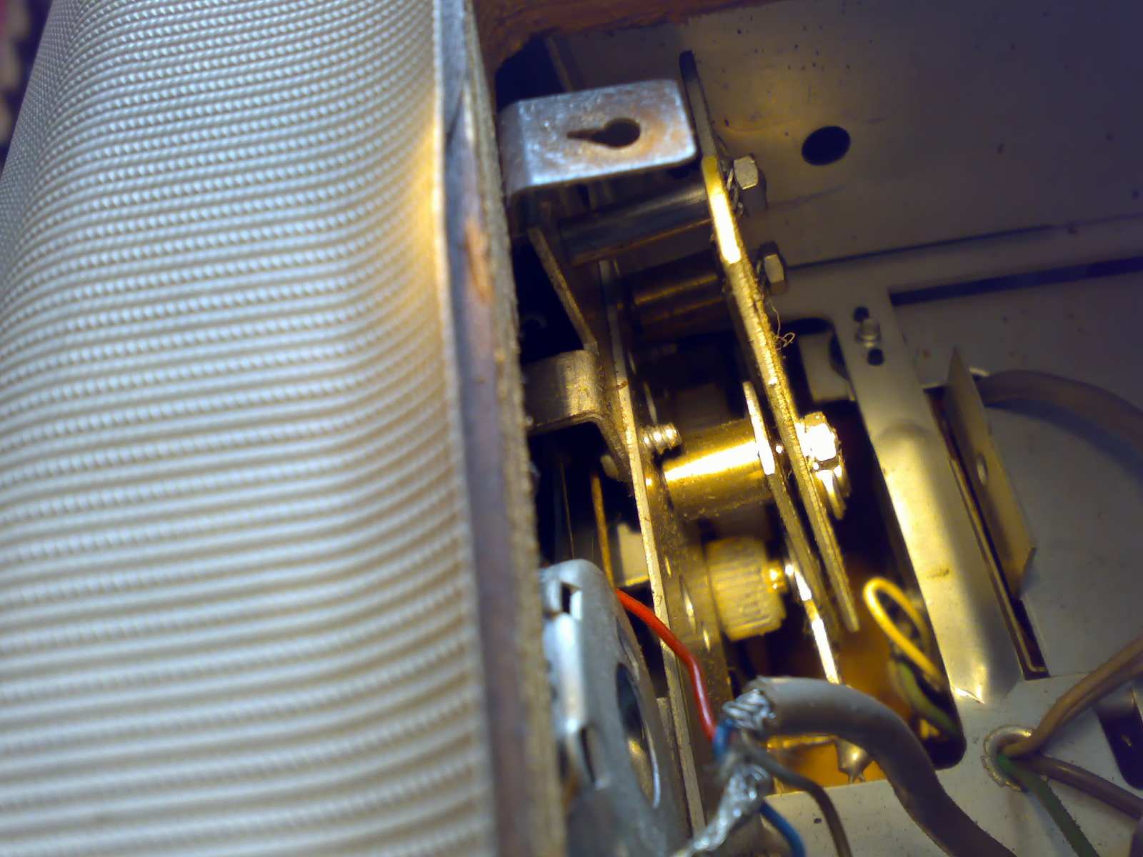 Bij de AM-FM overschakeling bedien je een klein staaldraadje. Dat trekt het bijbehorende kunststof tandwieltje tegen het asje van de zenderzoekknop. Zo bedient de knop 2 verschillende zenderwijzers en varco's.