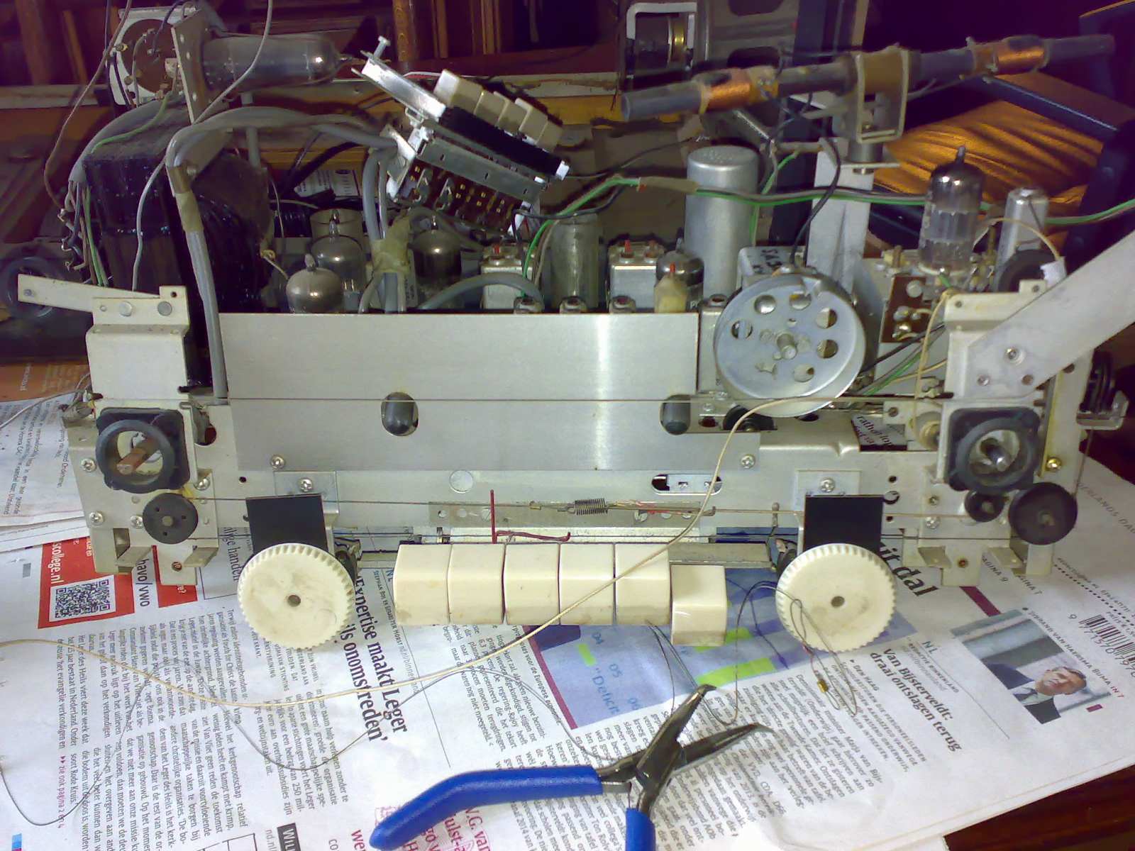 Toen alles goed zat, dacht ik, bleek dat het verbindingsveertje over de buitenste geleidewieltjes wilde lopen.....