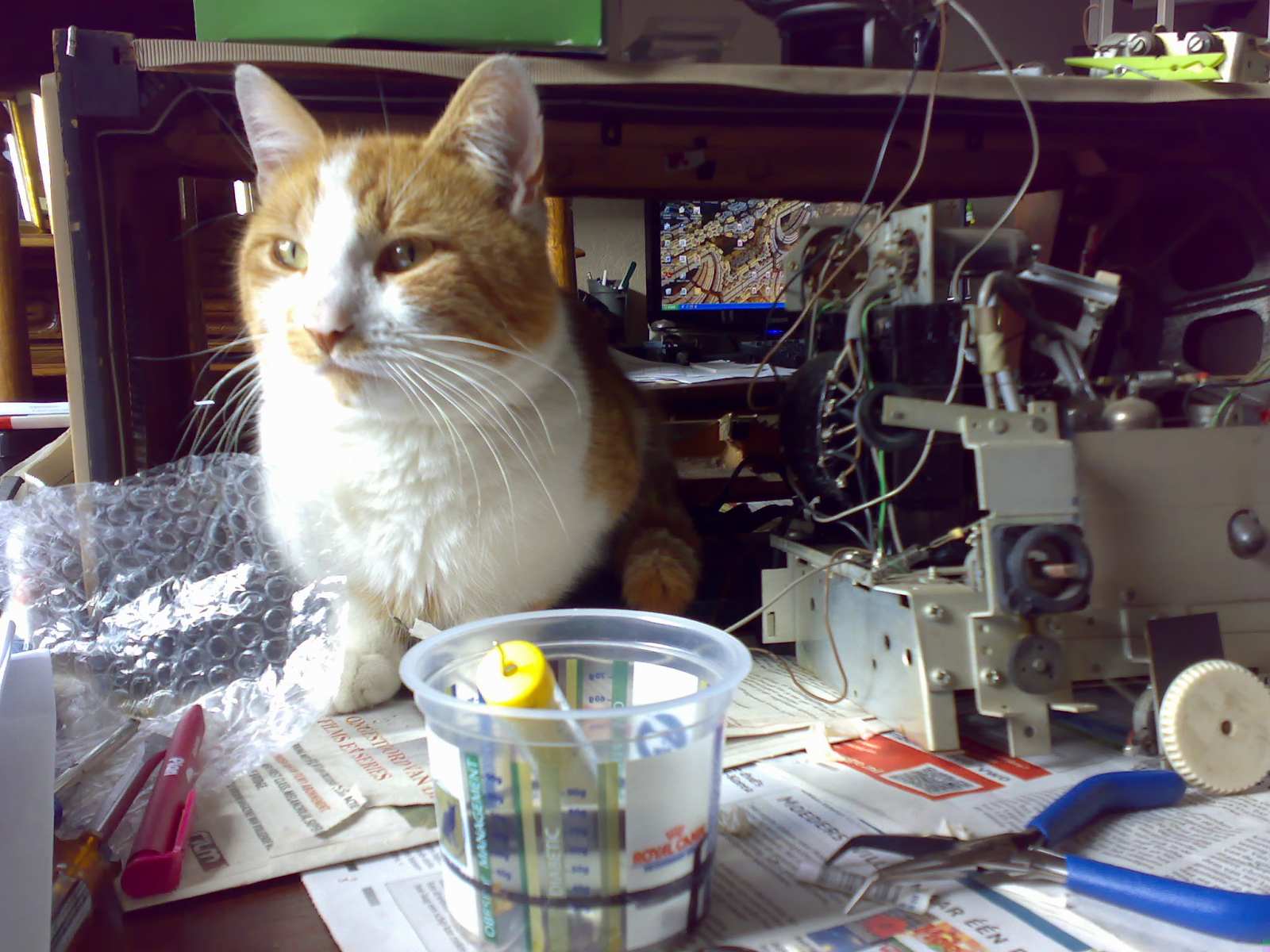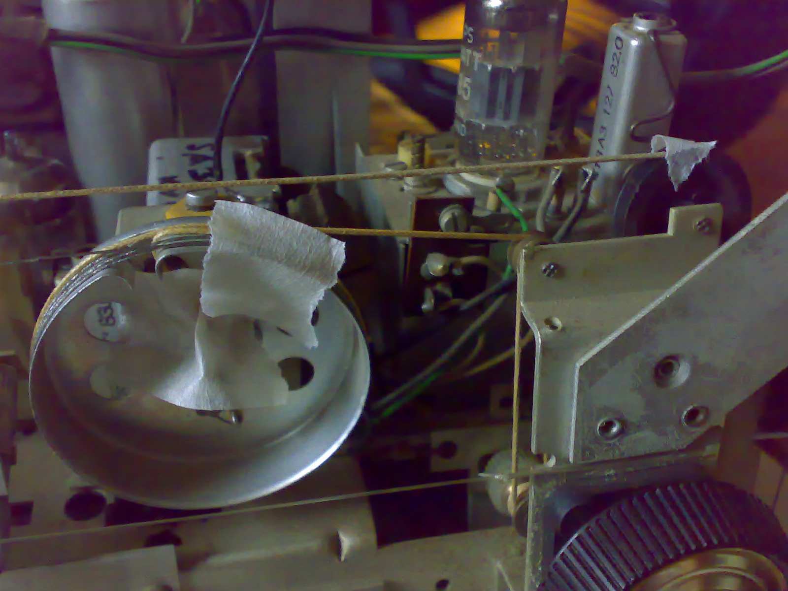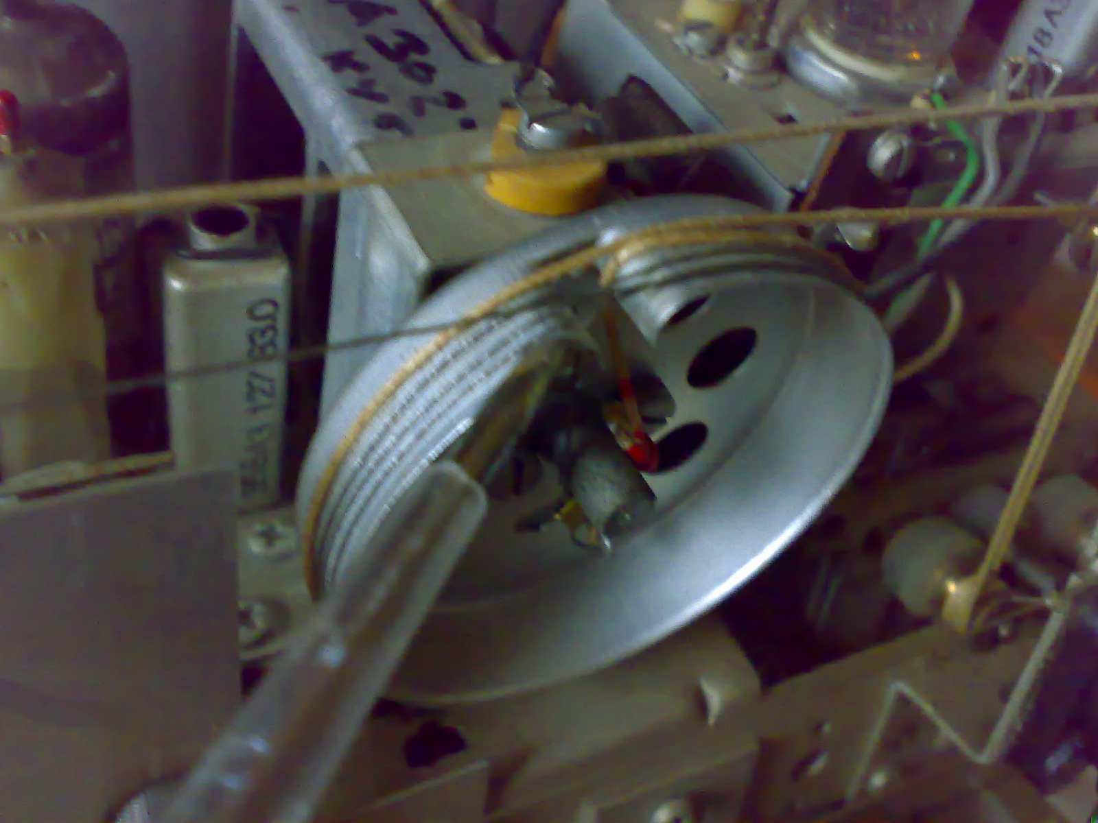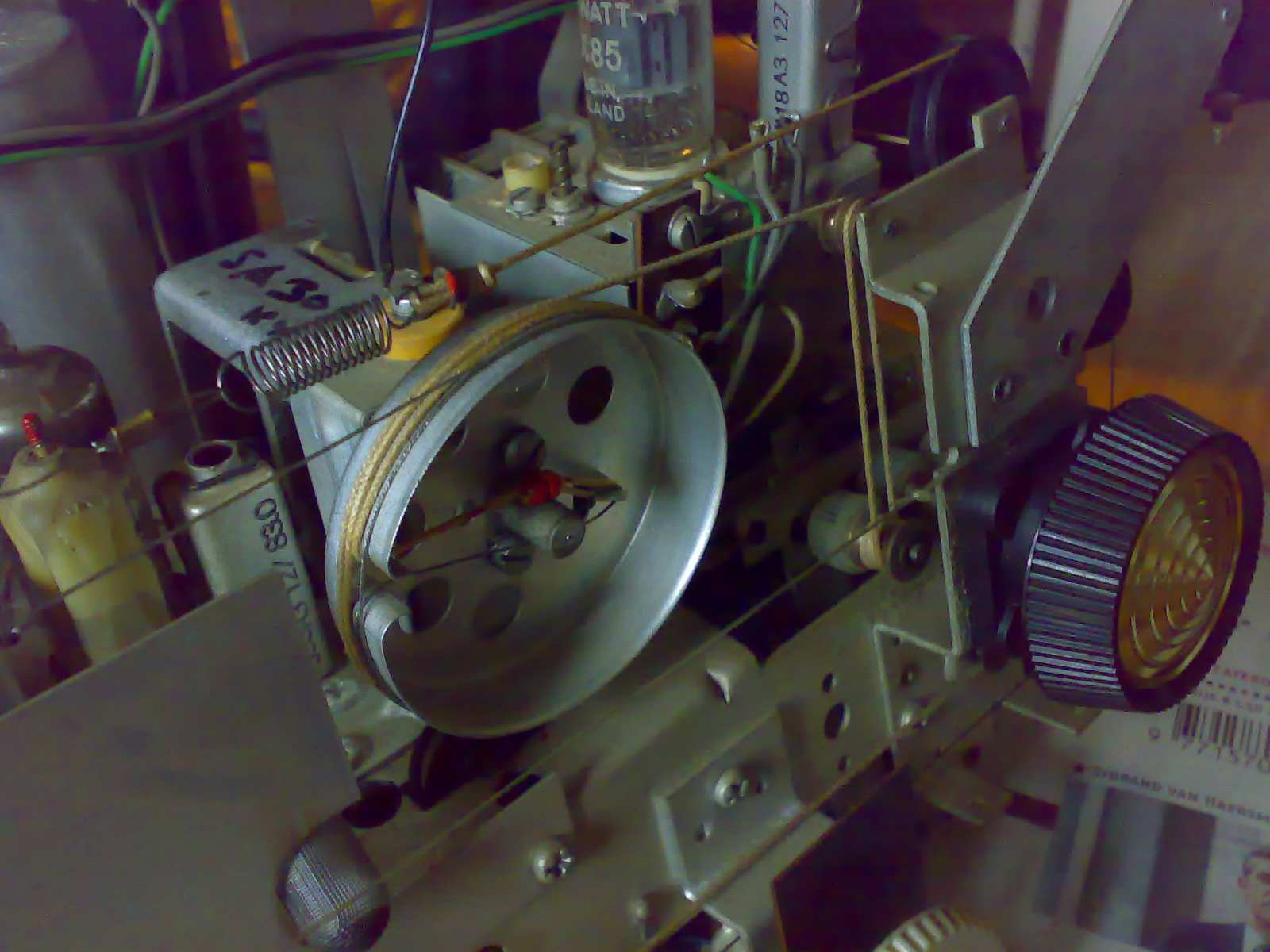 Het zenderkoord is deels katoen? deels staaldraad. Het geheim, zo ontdekte ik, is de boel zoveel mogelijk fixeren. Dat doe ik deels met een plakbandje, deels door de varco geheel uit te draaien, zodat de poelie niet kan verdraaien.