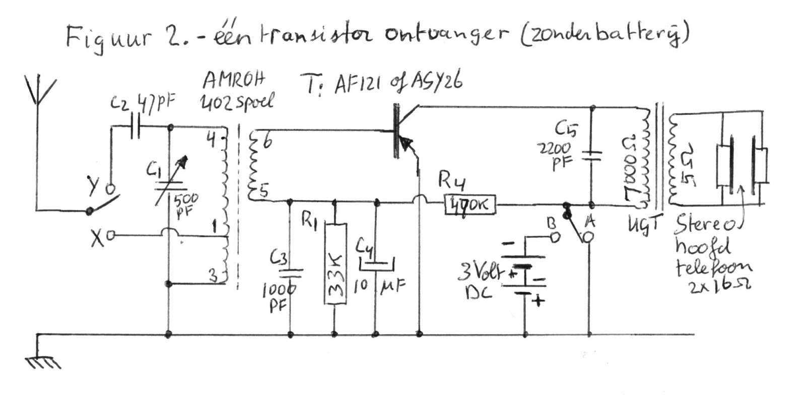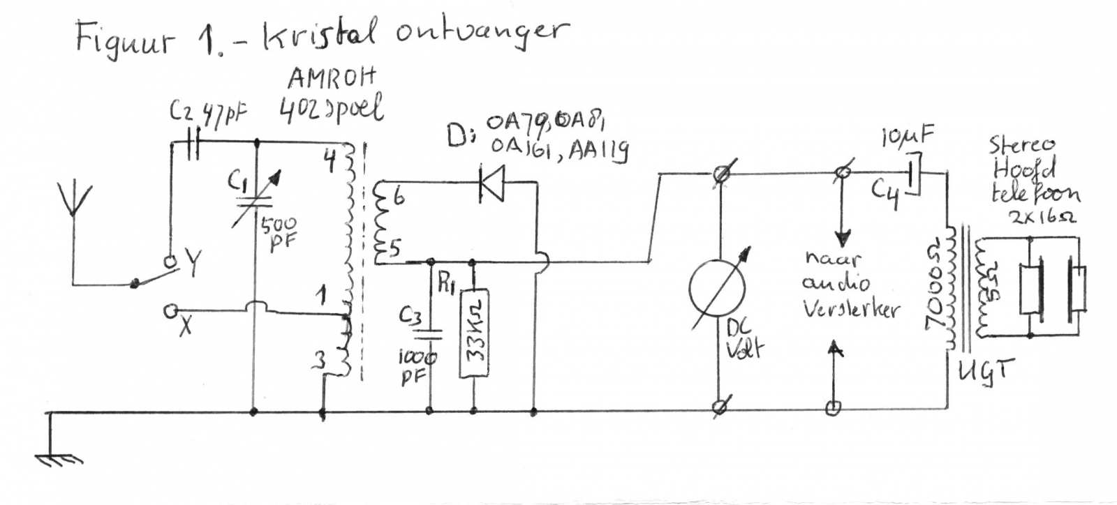 Mijn idee was om eerstens de Philips Pionier 1 junior radio weer op te bouwen. Maar essentiële onderdelen, zoals de ferriet staaf met spoel en het kristal oor-telefoontje, ben ik lang geleden al kwijt geraakt. Echter ik heb nog wel een AMROH 402 spoel en ik heb daarmee een schakeling uitgewerkt. Als vervanger voor het oor-telefoontje heb ik een moderne stereo hoofdtelefoon genomen en deze aangeloten via een 7000 naar 5 ohm uitgangs transformator. Figuur 1 toont het schema: