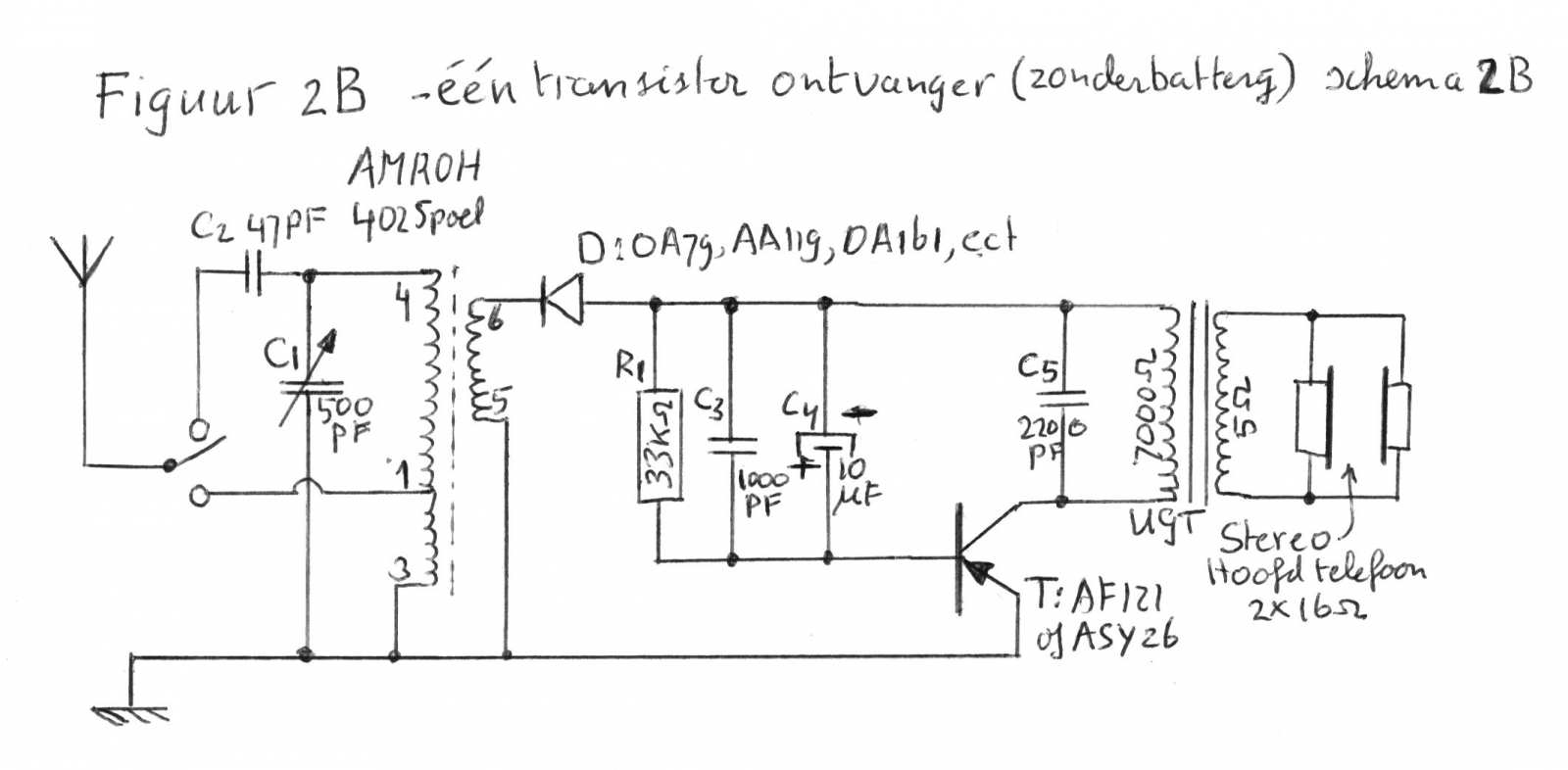 Op www.pa4tim.nl/?p=1378 staat nog een ontwerp van een batterij-loze één transistor ontvanger welke mij interessant genoeg leek om ook eens uit te proberen. Het is het ontwerp met zowel een punt-contact diode èn een transistor. Ik heb het schema aangepast en opgetekend in figuur 2B.