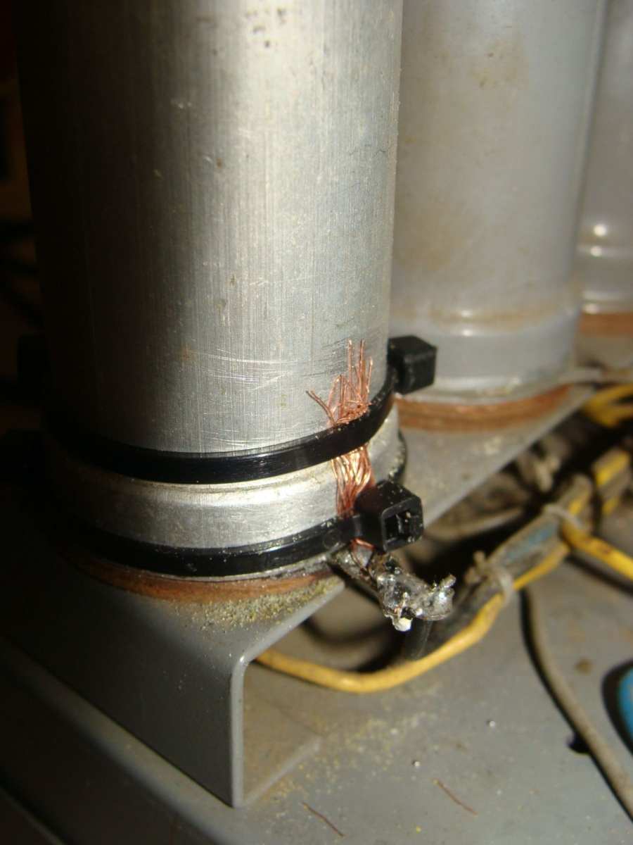 Uiteindelijk bleek dat de – aansluiting van een van de beker condensatoren niet jofel was plhilips Gebruikte daar een ring met soldeerlip voor welke onder de bus is gemonteerd en geïsoleerd tov. Massa.