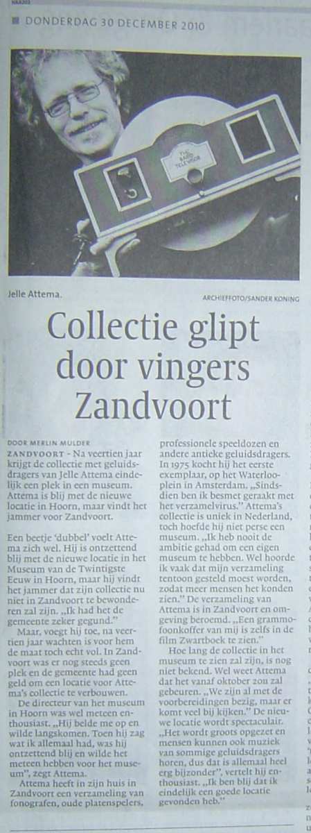 dank je dat jullie allemaal zo masaal reageren op mijn post de collectie attema is een van de grootste ter wereld en het blijft vreemd als goede vriend van jelle on zijn phono's nu achter glas te zien heel indukwekend nog indrukwekender is dat dit nog niet eens de helft van de attema collectie is er was gewoon niet genoeg ruimte in eerste instantie stonden pepaalde topstuken simpelweg achter een koord maar gezien de veiligheid is dat van de baan en zijn deze machines terug naar jelle want je loopt heel makelijk met een lioret fonograaf onder je jas het gebouw uit en dat is natuurlijk niet de bedoeling het is een leuke opsteling in het museum maar wij (jelle en ik)hadden liever een chronologische opstelling gezien leterlijk van tinfoil tot orthophonic wij vinden deze opstelling net iets te chaotisch maar wat hoeveelhijd betreft echt een trekpleister. --groetjes tino--