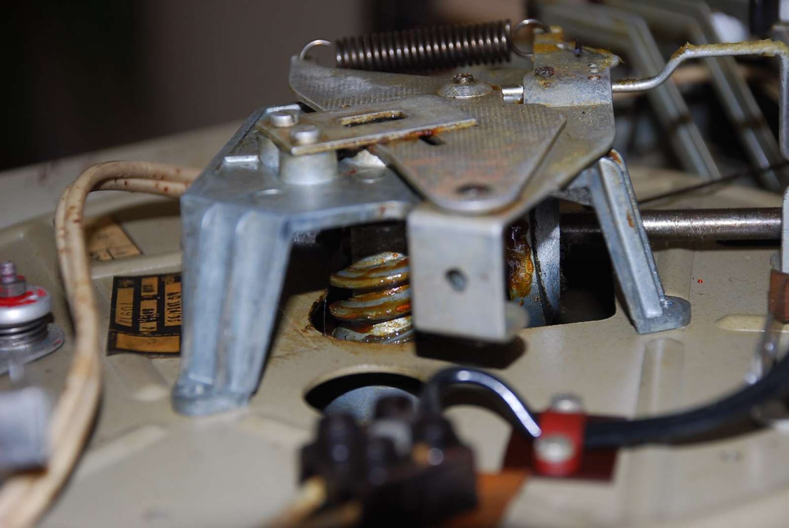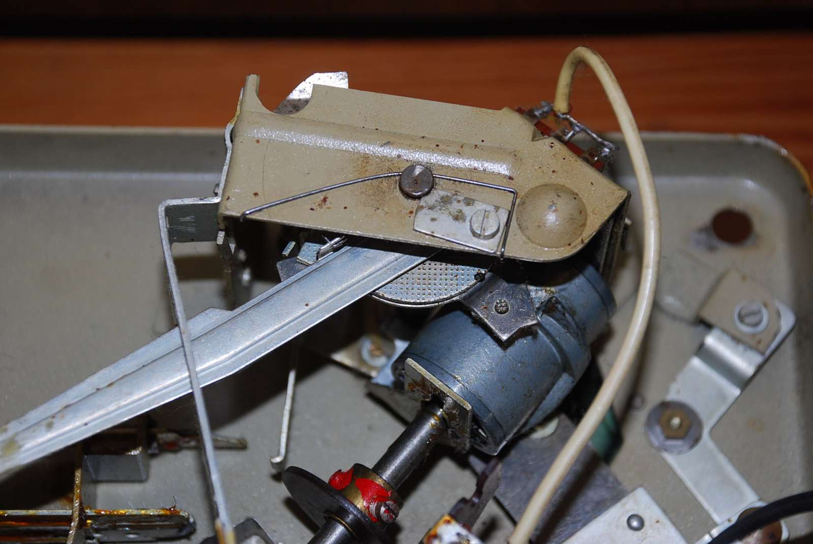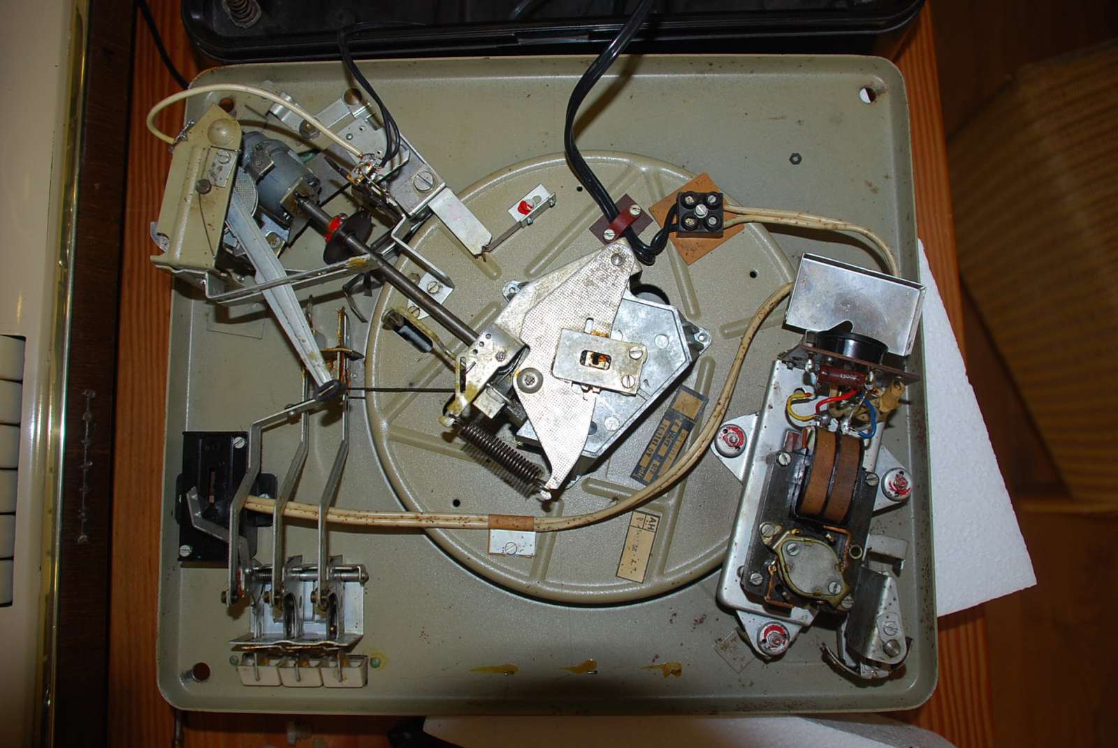 ik hem uitgeprobeert en hij werkt alleen de de afslag deed het niet als het armpje terug op zijn steuntje kwam bleef hij draaien het schakelaartje heb ik open gehaalt het veertje drukte het palletje niet meer om hoog veertje beetje opgerokken en het werkt weer