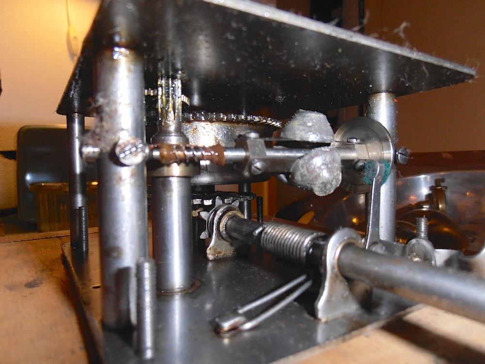 het foutje is dat de veerpot weinig of geen ondersteuning heeft en de veerpot deksel los op de veerpot zit met een beetje pech kan het hierdoor gebeuren dat de veerpot tijdens het opwinden scheef gaat zitten waardoor de tandwielen gaan wringen en het ding dus niet speeld ik hoopte dat het rumbling geluid niet het gevolg was van dit foutje maar van opgedroogd vet in de veerpot
