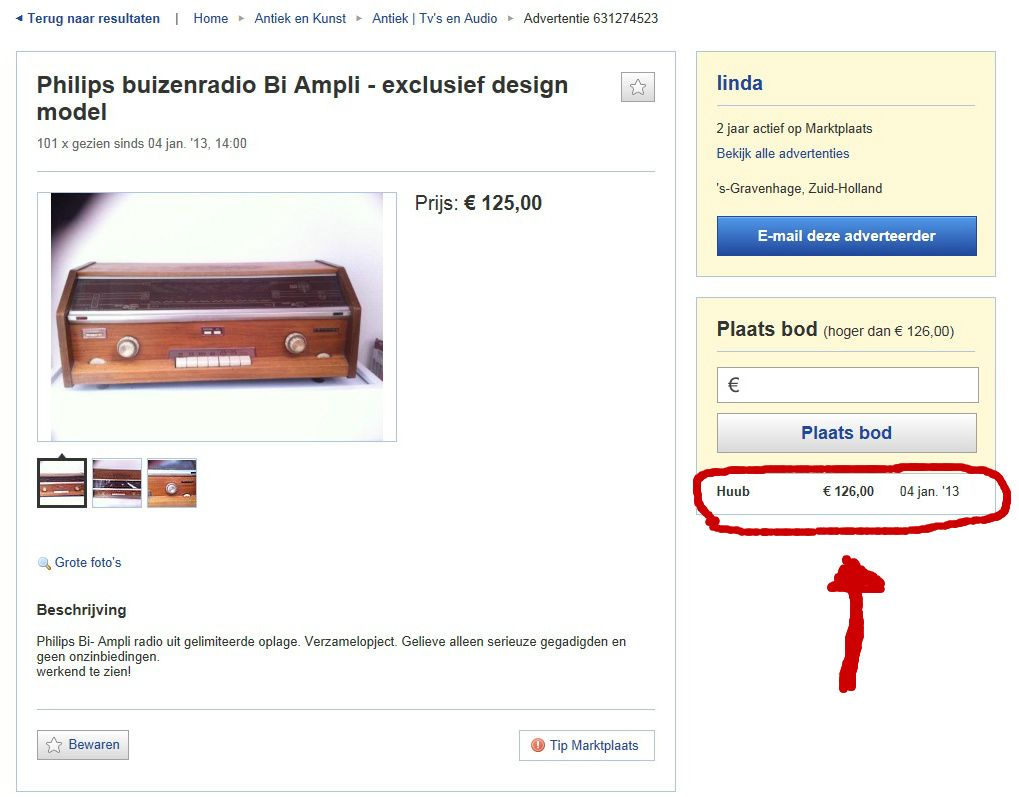Verder mag iedereen het van mij zelf weten wat hij/zij voor een object over heeft. Zo kocht ik een paar jaar geleden een Philips 37A, het Luistervinkje uit 1945 in echt originele staat, en misschien wel veel te duur, maar ik had het er voor over. Het was een van mijn laatste wensen op buizenradiogebied. Zo'n toestelletje kom je slecht één keer in de zoveel jaar tegen...... En van die hoge aankoopprijs heb ik nooit spijt gehad. Ik vind het een leuk ding: