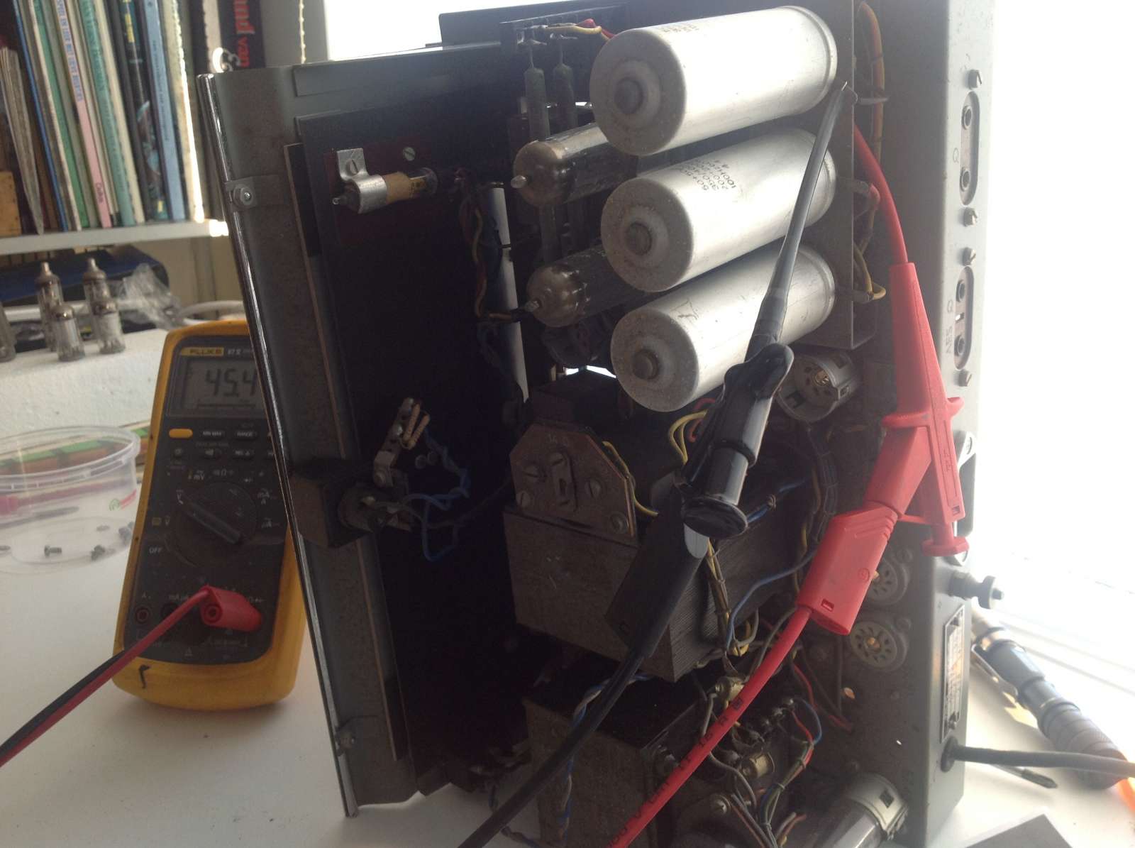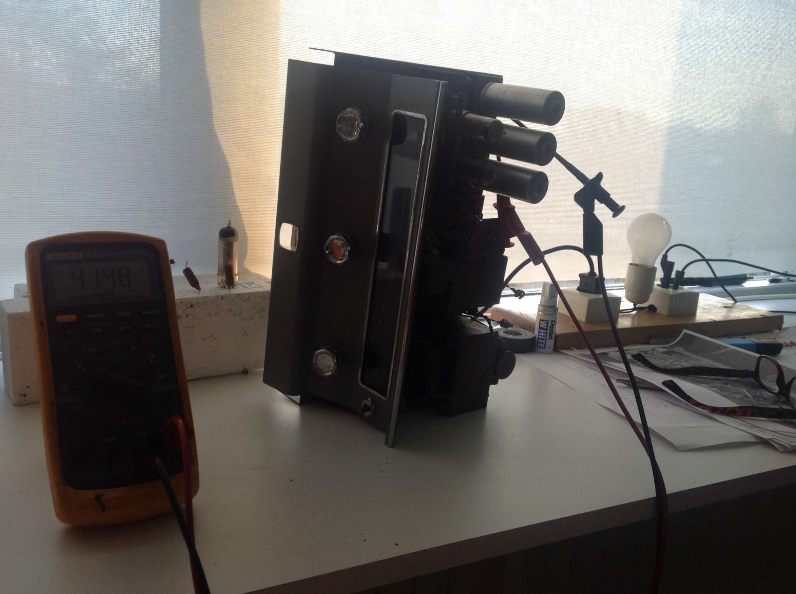 Hallo ,toch wat problemen met spanning op voeren alleen met de gelijkricht buizen er in gaat het goed de gelijkricht Elio,s komen dan ook boven de 100volt schaal verlichting begint ook te gloeien