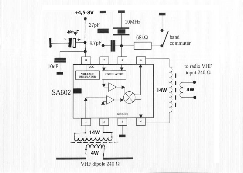 Veel wat oudere radio met een FM frequentie lopen tot 100 MHz. Dit ontwerp geeft de mogelijkheid om de radio af te stemmen tot 108 mHz. De kern is gebaseerd op een mixer IC type SA/NE602, als alternatief kan ook een NE612 worden gebruikt. De schakeling verschuift de frequenties rond 10mhz naar boven en naar beneden. Aan de hoge kant van de band naar 108 MHz aan de lage kant wordt een zender op 90 MHz dan op 100 mHz ontvangen. een keuze van 12 MHz zou theoretisch een betere keus zijn geweest. Echter 10 mHz is wat eenvoudiger op de schaal terug te vinden.