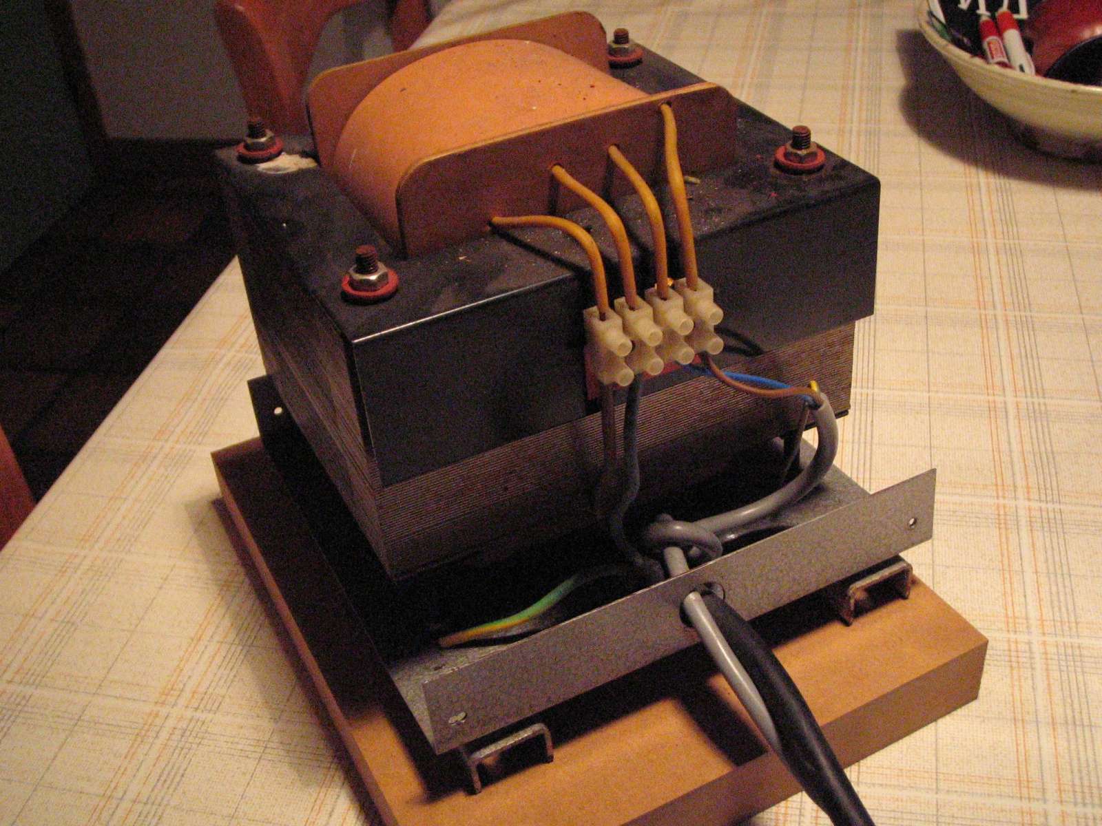 Die veel te zware trafo moet je allereerst voorzien van twee zware 5 ohm NTC R's, die je