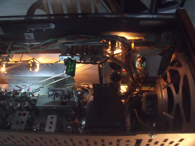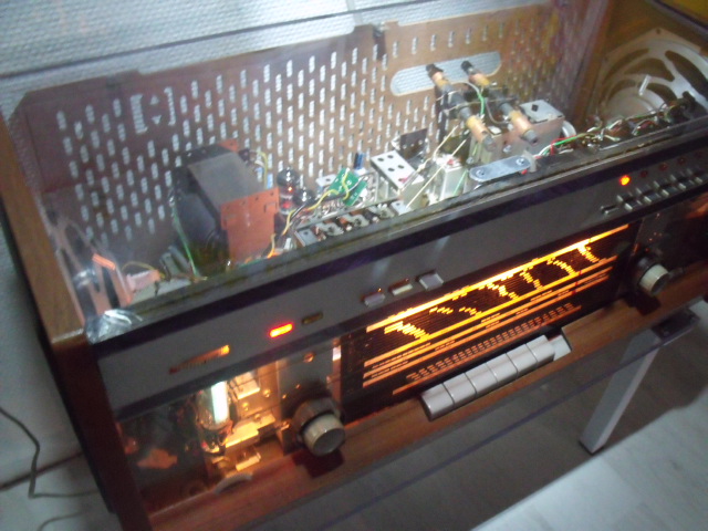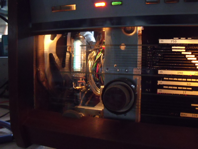 De zwarte verf achter de schaalglas gedeltelijk weggenomen om mooi het mechanisme en het magisch oog te laten zien. Jongeren vooral, staan verbaast te kijken hoe ingewikkeld zo'n radio is. Alles met de hand in mekaar gezet. Vintage komt ook in de mode bij jongeren,Hopelik komen mijn foto's er goed uit !