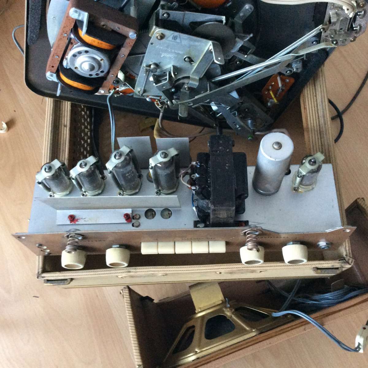 Het kan natuurlijk best dat de platenspeler defect is geraakt door een verkeerde spanningsinstelling. Zo te zien heeft de platenspeler een eigen spanningskiezer. Het kan echter best zijn dat deze op een andere, vaste stand moet staan, omdat de spanning voor de platenspeler van één der aftakkingen op de voedingstrafo wordt betrokken. Dit werd bij Dual koffers meestal zo gedaan.