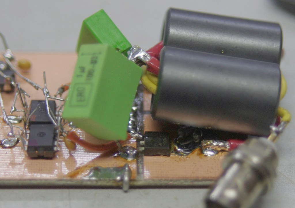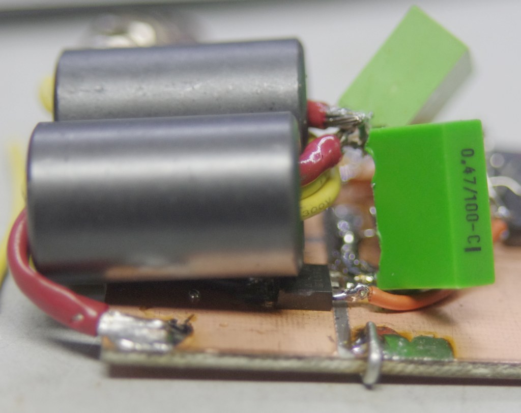 Dit is de trafo met de SUDs. Goed is te zien dat primair gewoon een draadje is en secundair twee windingen. FETjes vallen bijna weg. Grote kopervlak is heat sink.