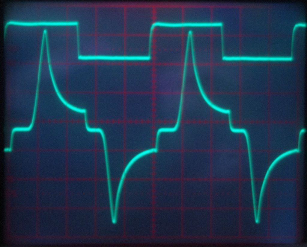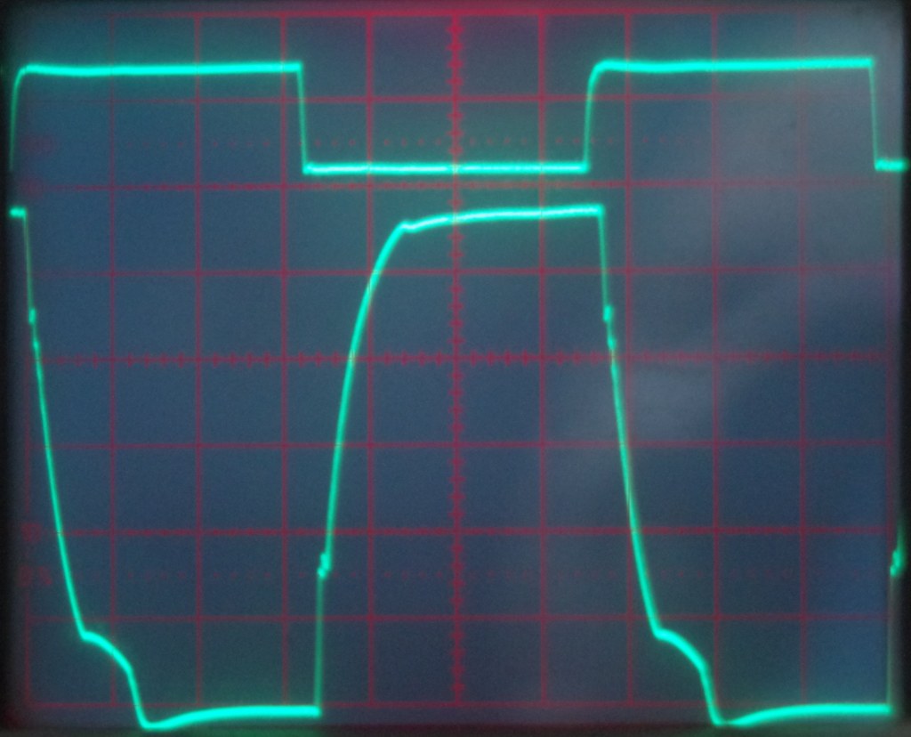 Output over dummyload, 20V/div. Met rare spike.