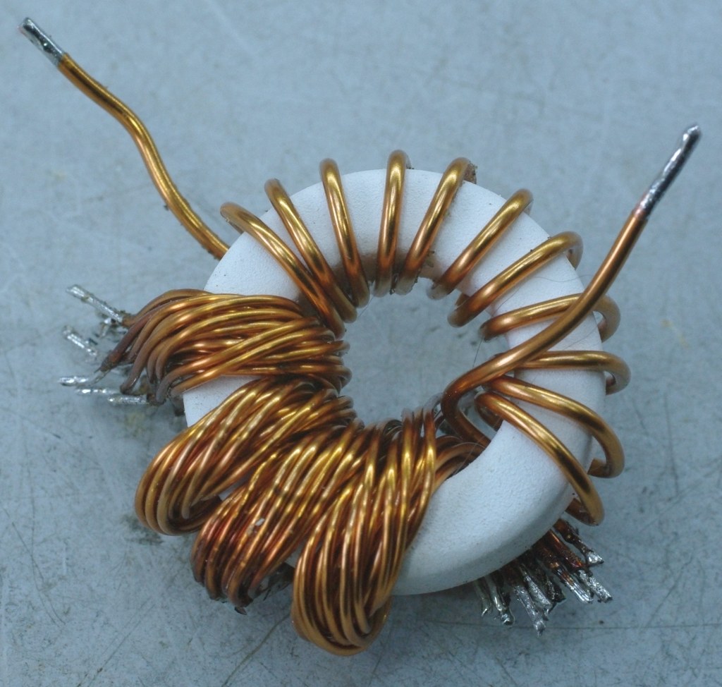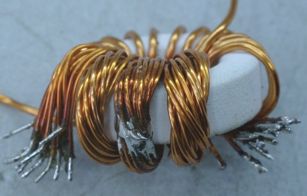 Uitgangstrafo op 4C65 toroid. Door zoveel draadjes te nemen wordt de oppervlakte 39x zo groot als met een enkele 1.6mm dia CuL draad. Wel errug lastig vertinnen. Rotklusje.