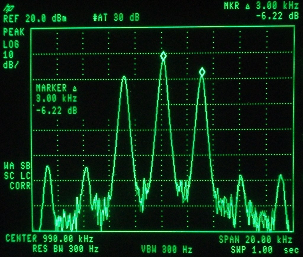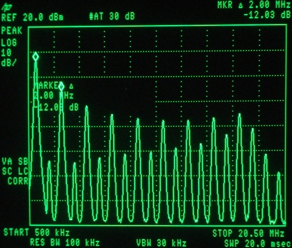 Uitgangsspectrum, 3fc is -12 dB down, 2fc -40 dB. Filtering is vrij simpel te realiseren.