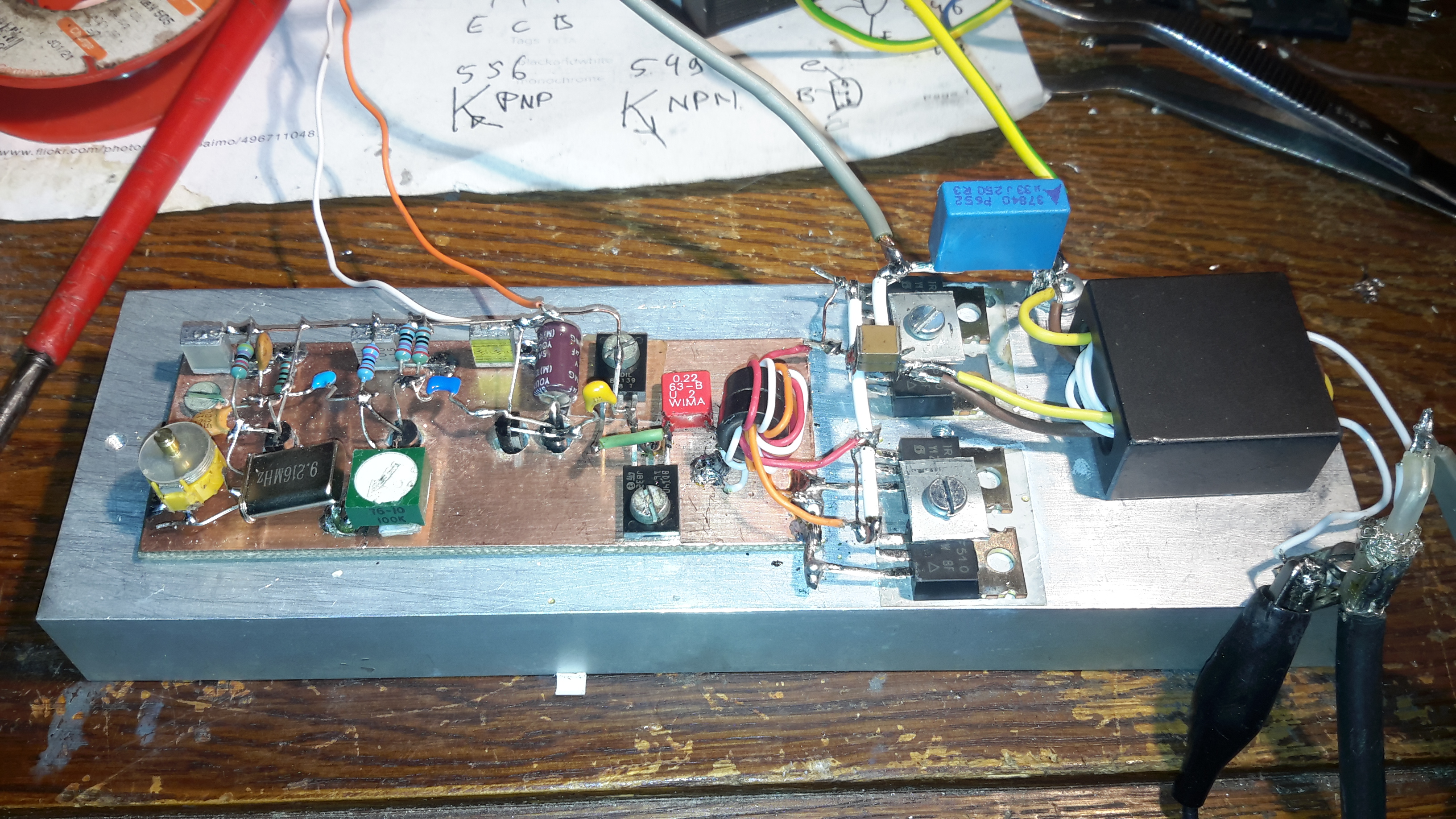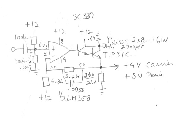 Ook nog effe snel een class A modulator in elkaar geflanst. Ding wordt met 5 W carrier (20 W PEP) bloedheet. Maar de modulatie is prachtig lineair. Foto's komen nog.