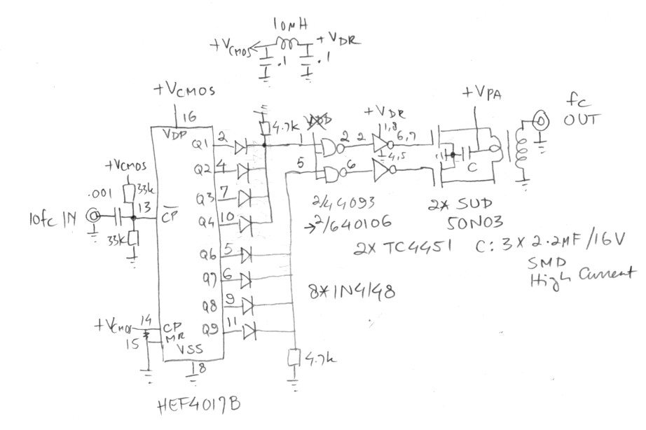 Speciale duty cycle generator, die heeft daarom 10fc nodig. Voor 990 kHz dus 9.9 MHz. Helaas kakt de HEF4017B er al bij 13 MHz mee uit (typ. 16 MHz). Motorola's MC14017 is nog trager. Maar het concept werkt als een tierelier.