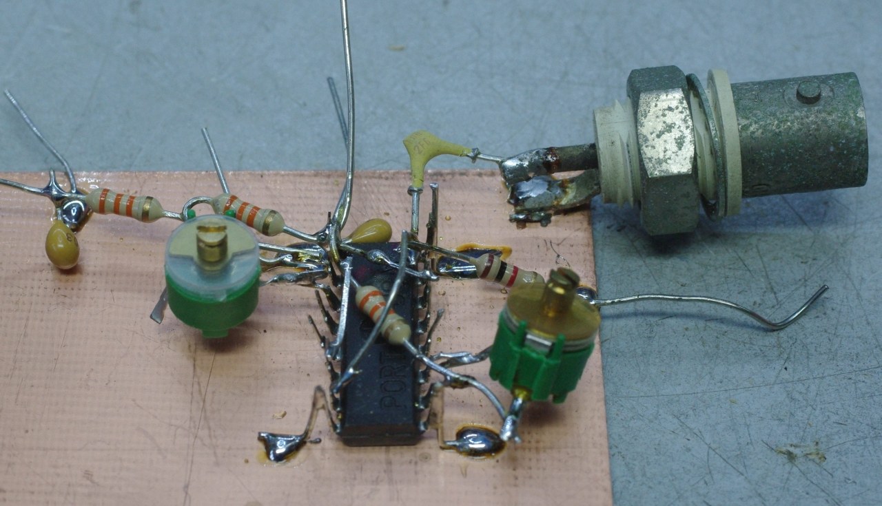 Dit is mijn carrier PWM experiment, vrij naar F3GZ. Hiermee ga ik niet door want het ding is zo niet-lineair als wat. OM F3GZ had dan ook een precorrector nodig. Kwam ik later pas achter. Verder krijg ik van z'n lang-zal-ze-leven ook maar bij benadering 100% modulatie. Nice try, but no cigar. 74LS123 gaat terug in z'n bakkie.