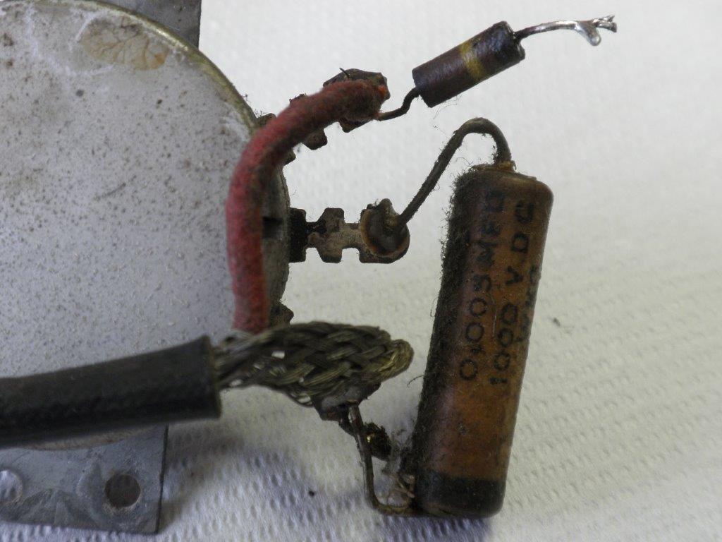 De potentiometer is een 1 Meg log type, de condensator 0,005MF en voor de weerstand meet ik 88Kohm(?). De toonopnemer is gesoldeerd aan de weerstand en de massadraad (zie foto)