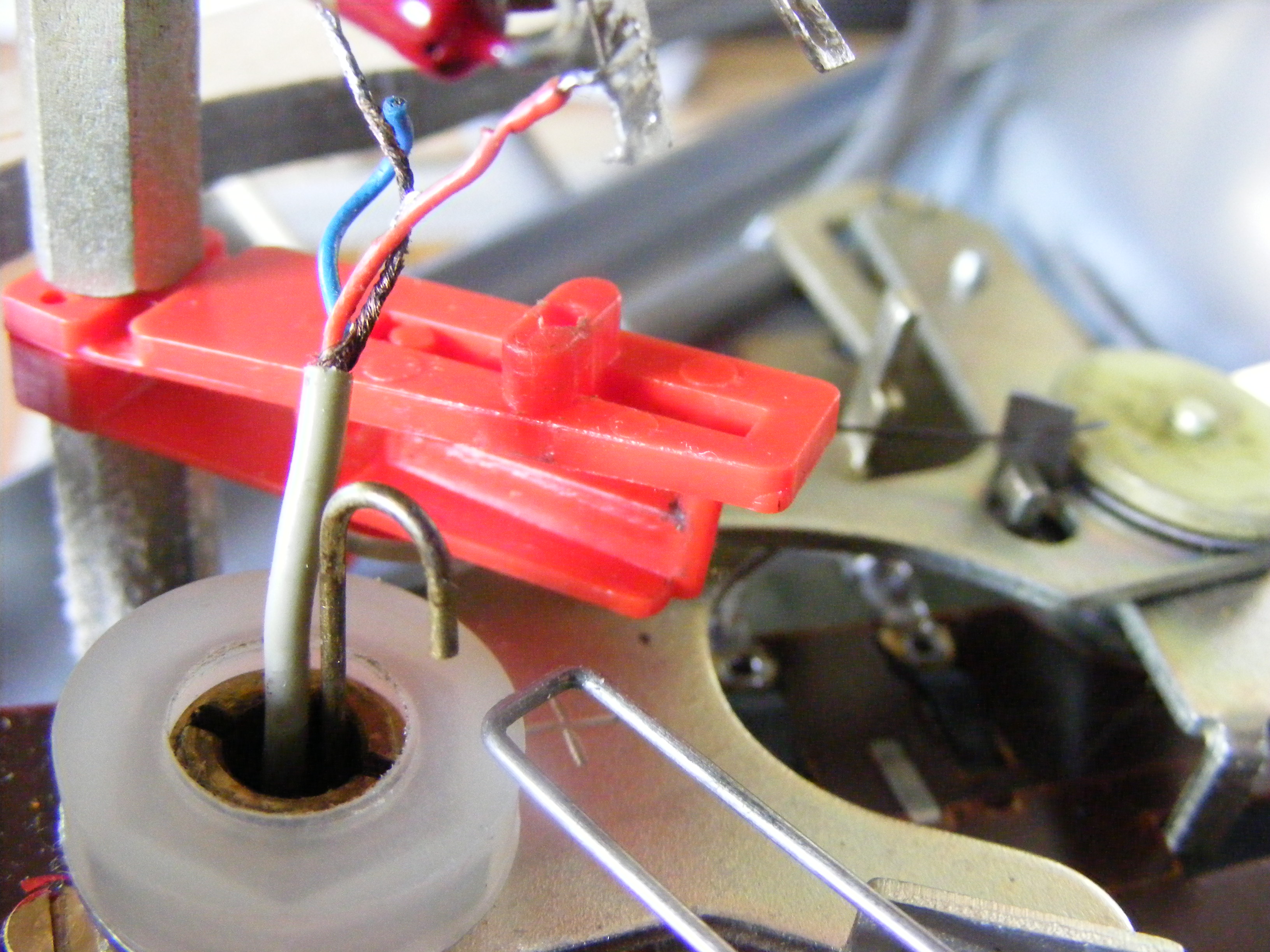 Het zit een beetje verscholen tussen de onderdelen, maar het rechthoekige haakje hoort tussen de rode plaatjes heen en weer te schuiven en het haakje dat uit de arm kom, hoort in het gaatje dat in het ovaaltje op het op de foto bovenste plaatje zit.
