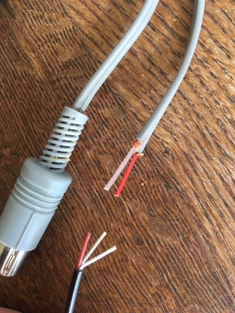 De grijze plug is een plug uit de DIN-serie. Uitgaande van jouw foto is de linker pin het linker kanaal , de middelste pin (die het dichtst bij de tafel ligt) de massa en de rechter pin het rechter kanaal. De rode draad is verbonden met de rechter pin, de witte/doorzichtige draad met de linker pin, en de afscherming op beide draden is verbonden met de massa (die is dus voor beide kanalen gemeenschappelijk).
