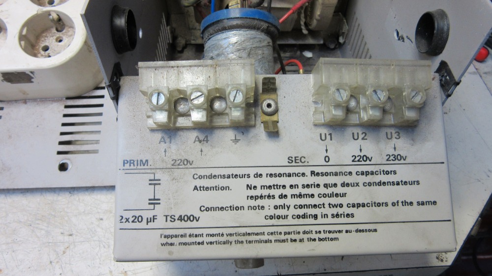 Toen maar eens open geschroefd en helaas geen enkele aanwijzing van fabrikant of vermogen, wel de tekst dat er alleen twee gelijke condensatoren aangesloten moeten worden (resonance condensatoren)