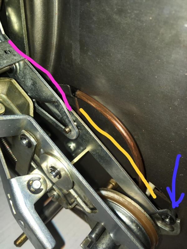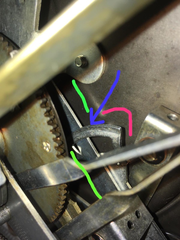 De speler (wisselaar) slaat aan het eind van de plaat niet altijd af. Ik doe een poging tot het uitleggen van het probleem: De arm brengt aan het einde wanneer deze in de afslag groef komt deel 1 in beweging (geel op de foto) bij de blauwe pijl zit het deel vast aan de arm. Deelt 1 brengt deel 2 (paars op de foto) in beweging.