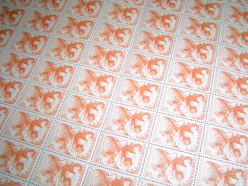 van de bevrijdingszegel uit 1945 zat. "Herrijzend Nederland 1945, 7,5 cent".