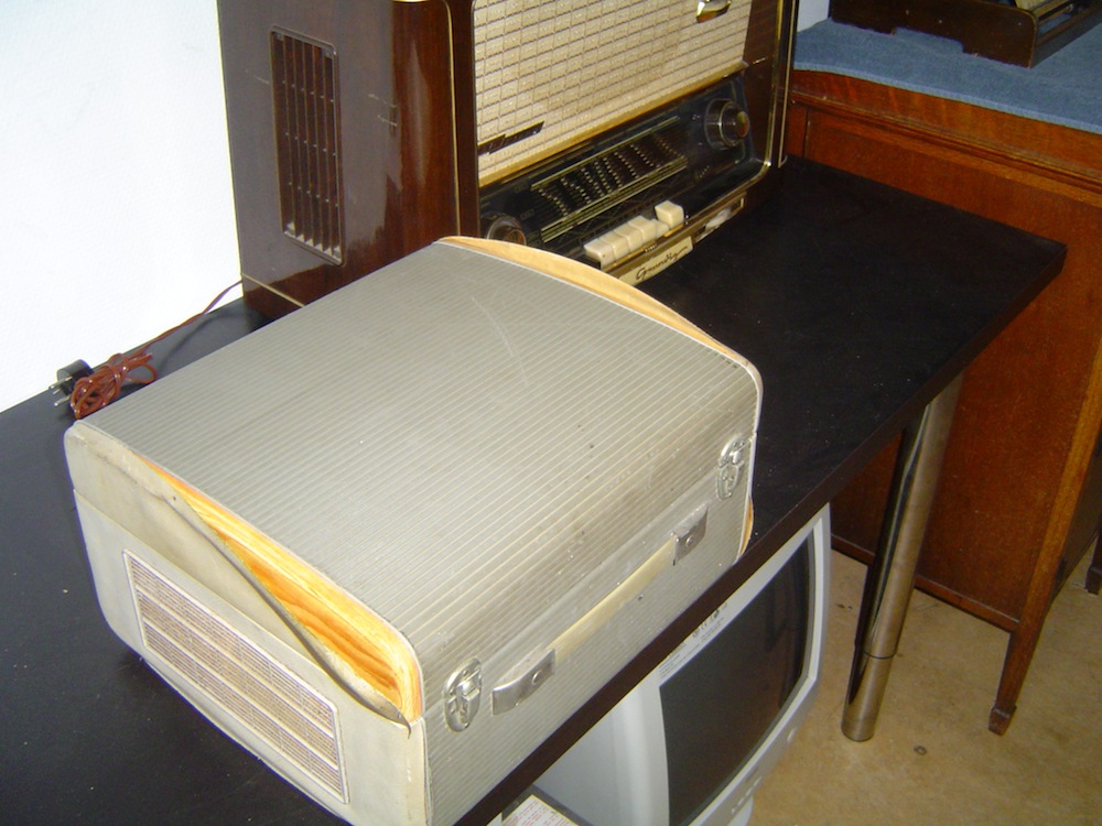 Dat was een AG9127 koffergrammofoon. Het vinyl zat voor 70 procent los.