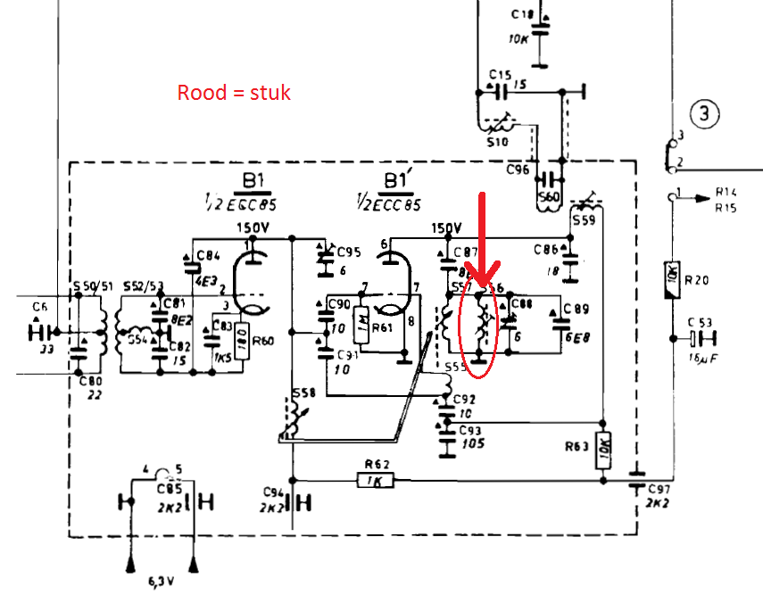 In een ander topic gaf ik aan een Philips B6X04A radio te hebben gekocht die, op de FM na, prima werkte. Na vervanging van de ECC85 en de EM80 werkte de gehele radio eigenlijk prima, alleen klopte de oscillatiefrequentie van de FM nog niet helemaal. Door deze te hebben afgesteld met de C88 afstemcondensator werd de ontvangst steeds beter. Jammer genoeg zat de variabele spoel niet meer helemaal vast, waardoor deze na een maal draaien los van het frame brak. Deze is dus nu stuk en zit het ferriet in de spoel helemaal vast. De oscillatiefrequentie krijg ik nu dus niet meer optimaal omdat de spoel nu een (onbekende) vaste waarde heeft, omdat het ferriet vast zit.