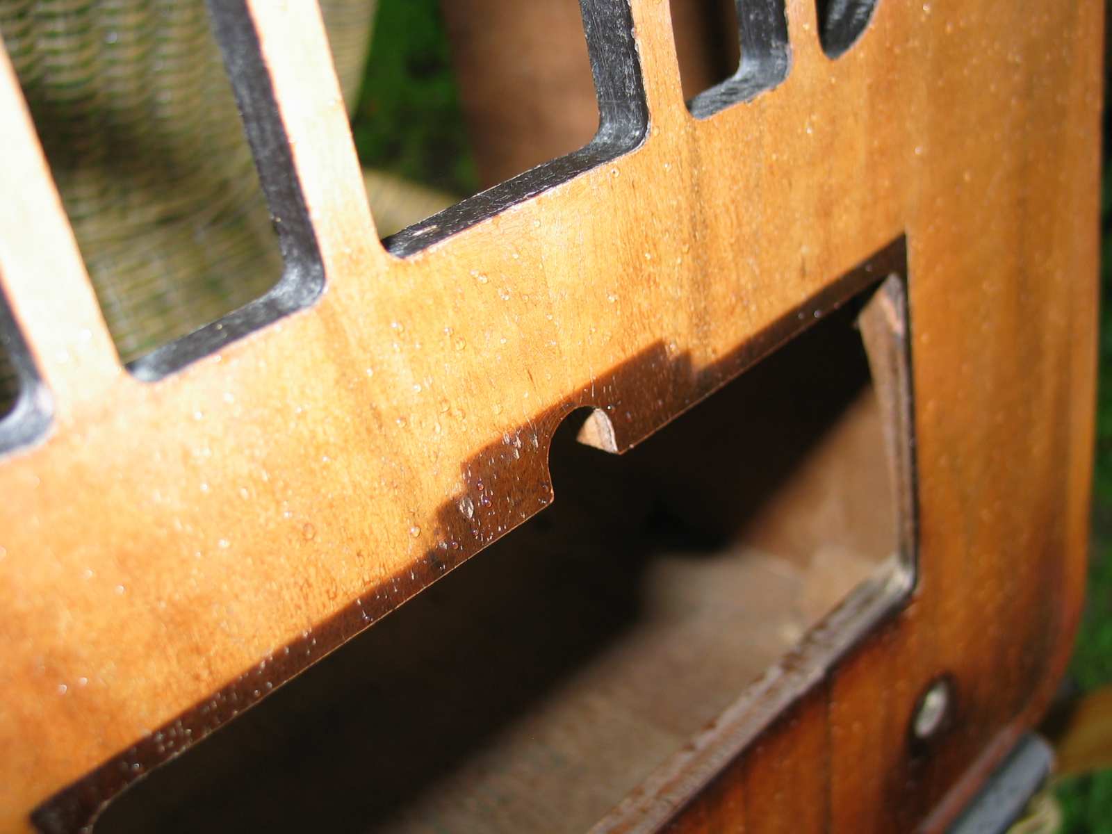 Ik denk zelf dat de kast oorspronkelijk veel donkerder is geweest en gebleekt is door het zonlicht. Dat ontdek ik ook aan de kast van de 529U van René R, waar ik momenteel mee bezig ben. Het gedeelte waar nooit licht bij gekomen is, onder het bakelieten schaalframe, heeft nog de oorspronkelijke kleur.
