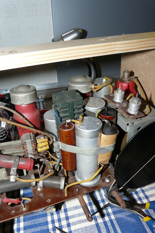 Ben begonnen met het bestellen van vervangen buizen. De teercondensatoren aan een kant losgehaald en getest en zoals ik aan de buitenkant al vermoede waren ze op twee na allemaal slecht. Deze dus vervangen door nieuwe. De kapotte weerstanden vervangen en ook de elco,s gereviseerd, die hadden allemaal gelekt en dus uit voorzorg vervangen. De nieuwe in de oude behuizingen verstopt, zodat alles er oud uit blijft zien. Ook de gelijkrichter verwijderd, deze hoort er niet en vervangen aan de onderkant door een diode en een weerstand.