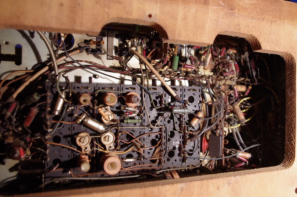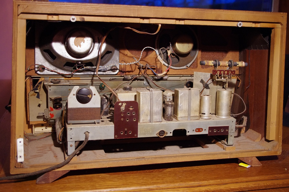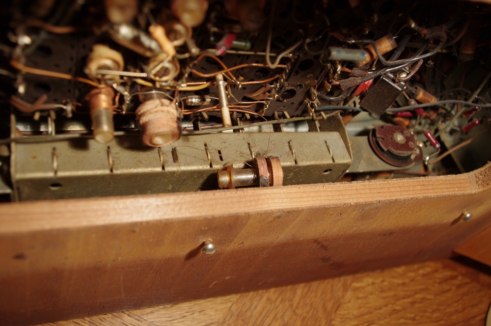 Nu vind ik een beetje opknapwerk niet erg, hij speelde dus ik had enkel verwacht wat oudere componenten te vervangen en zo, maar ik mis gewoon de helft van de radio : huh Ik weet ook niet of ik hem veilig kan aansteken met die schroef die zo los zit en al het stof...ik zal er zowiezo iets mee moeten doen vrees ik, buiten de kabel vervangen...