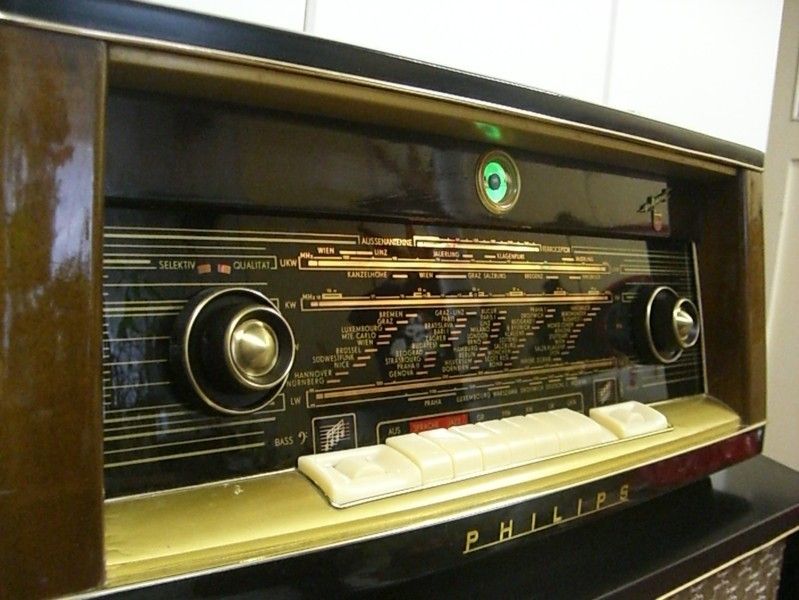 Tot verbazing zie ik dat er een eind 30er/begin 40er jaren Philips embleempje op deze radio geprikt zit.