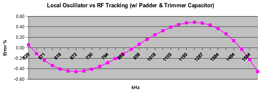 Dit is het resultaat van een avondje klooien met de diverse parameters in de spreadsheet. De antennekring heeft een spoel van 171 uH en een trimmer die op 11 pF staat. De oscillatorkring heeft een spoel van 94.8 uH en een trimmer van 25 pF. In serie met de afstem-C van 522 pF (van de LO) staat een padder van 560 pF. Die mis ik overigens in het schema, dus da's ook een reden dat-ie voor geen meter werkt.