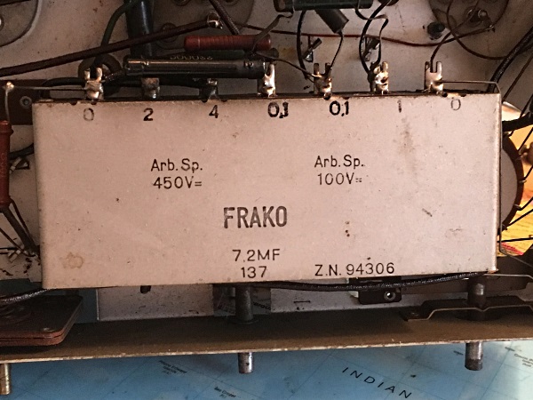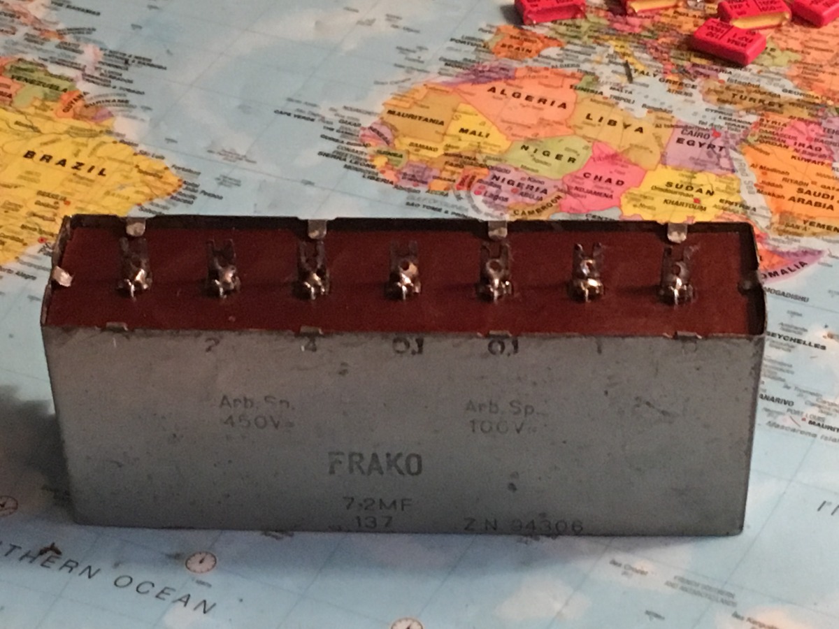 Het condensatorblik aan de onderkant van het chassis zat er nog origineel in, de overige condensatoren zagen er behoorlijk vermoeid uit.