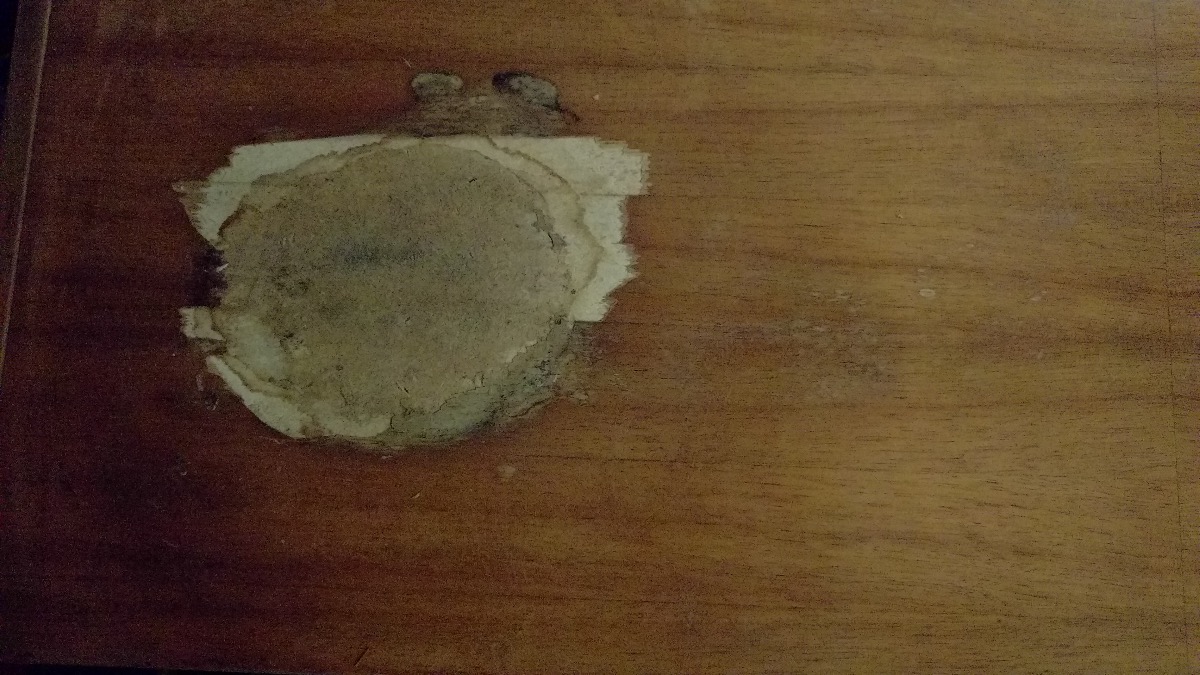 Het fineer aan de bovenkant van de kast had dat niet overleefd en was verdwenen tot op de spaanplaat. Grote schrik!