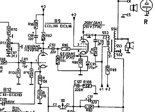 hier zou je +1 (285 volt ) moeten meten. verder alle spanningen volgens het schema rond de ECL86.