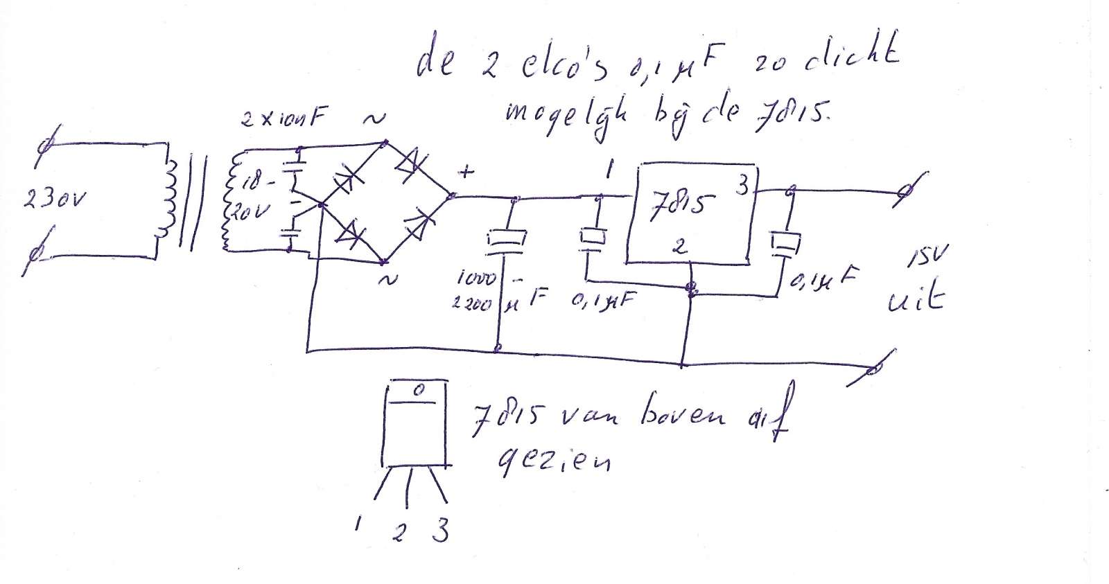 een 7815 uitgang weer 100nF naar massa en een elko van 100uF.