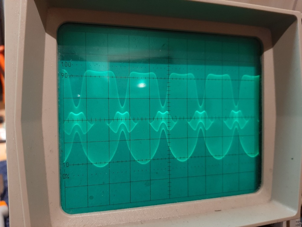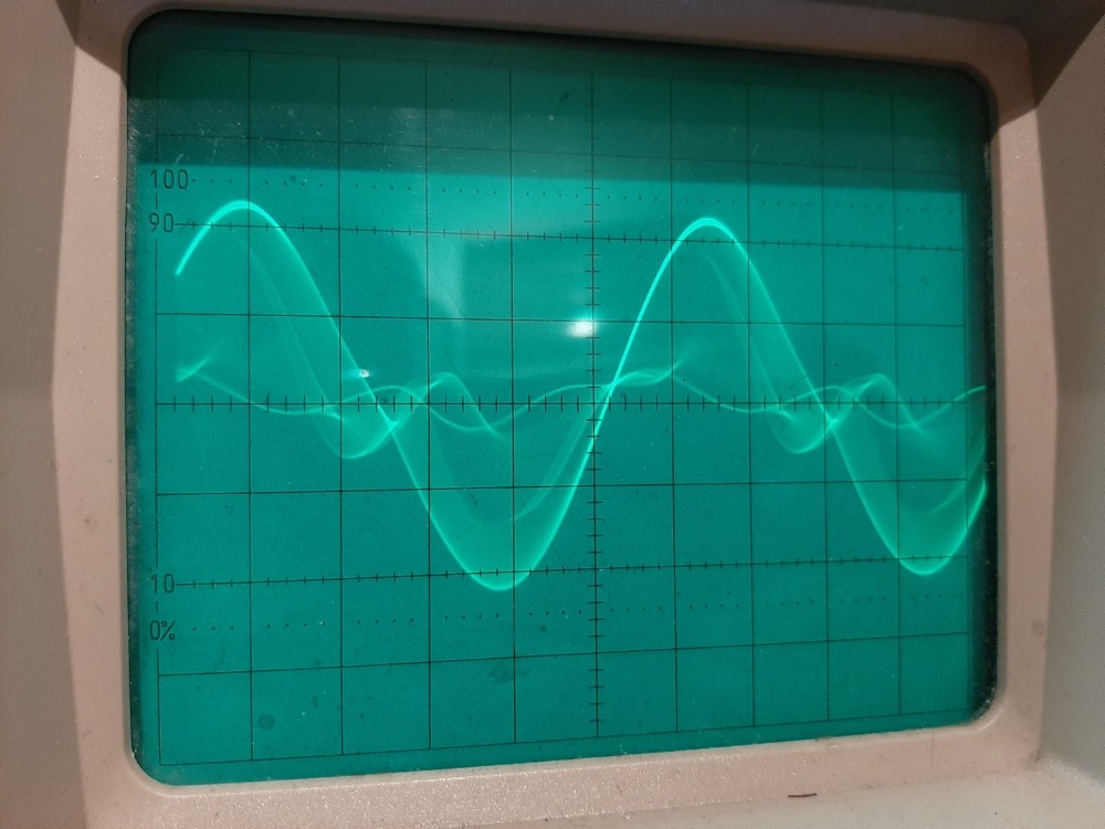 Maar wat zie ik nu op de scoop? Welk punt? Amplitude? Basis van de BD135? Mooi gereverse engineered schema maar ik kan hier zonder context geen brood van bakken. Wel vraag ik me af waar die maffe kronkel van komt. Die mag er niet zijn. De eindtrap is lineair dus die troep komt ook in de antenne.
