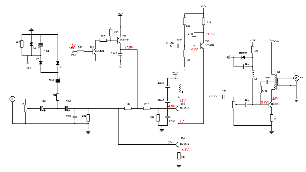 Frank, een BF469 is een hoogspanningstransistor. niet geschikt voor deze schakeling. De BD135 heeft een Transition Frequency van 50 MHz, da's maar 10 MHz lager dan de BF469.