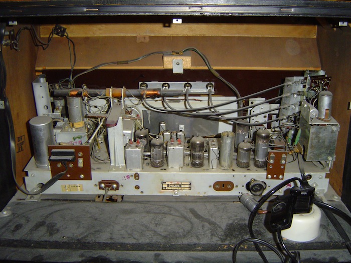 Alleen bij het meubel zat een pertinax "stekker" tussen de trafo en chassis.