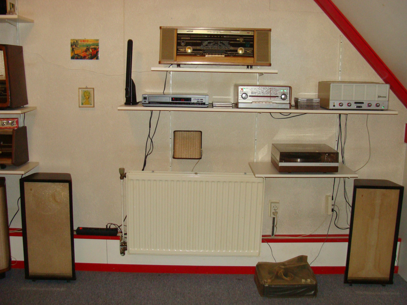 De hoekkast onder de B7X73A plus de satellieten zijn aangesloten op de HQ radio B7X73A welke door Peter en Henk voortreffelijk gereviseerd is.
